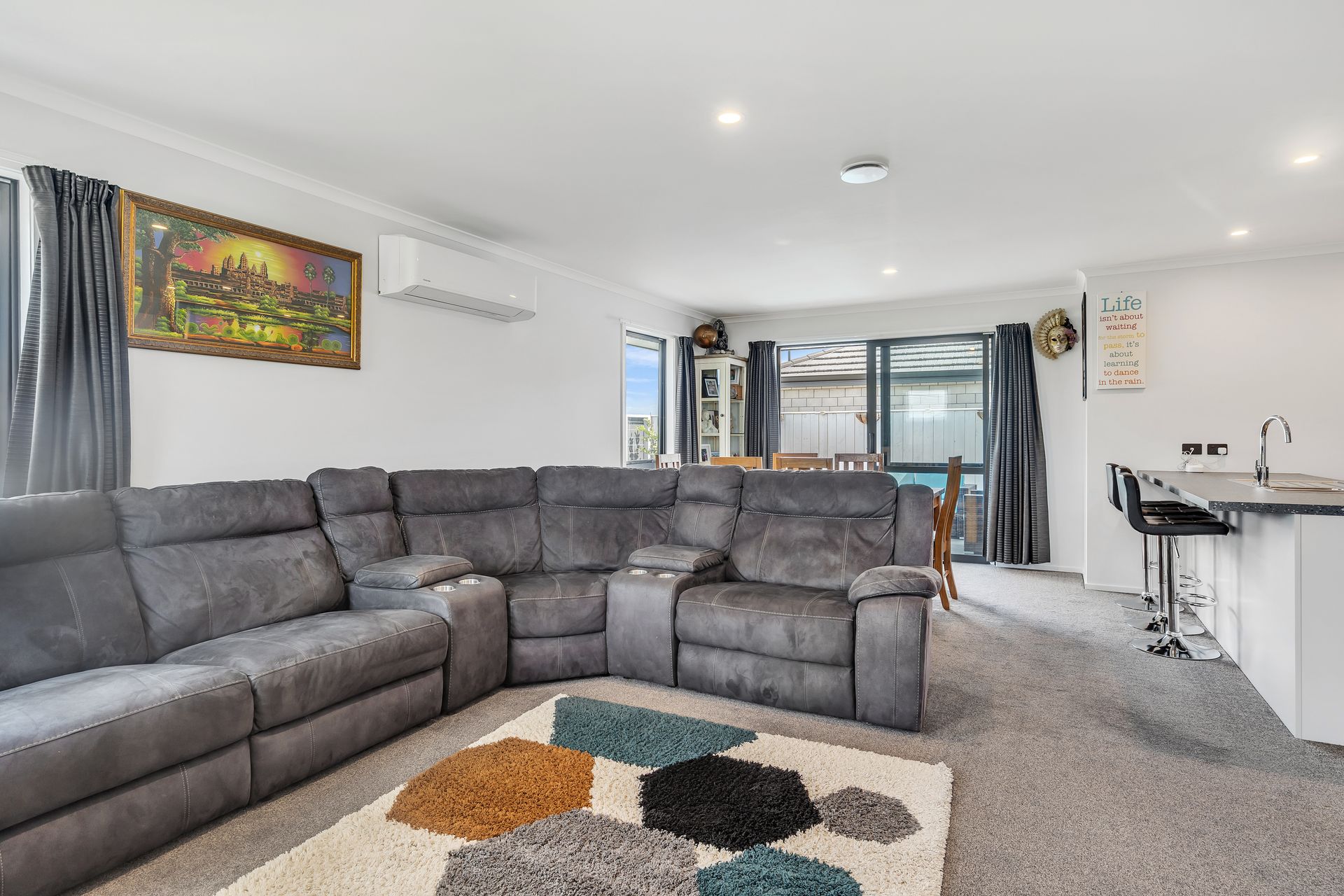 The layout is straightforward and functional, with open-plan kitchen, dining and living forming the central hub of the home. The kitchen features stone-look benchtops, a breakfast bar, modern appliances and good storage, connecting comfortably with the dining area and lounge. A heat pump provides year-round comfort, and sliding doors open to a private courtyard patio for easy indoor-outdoor flow. The patio offers a functional space for outdoor dining, relaxed entertaining or weekend barbecues.