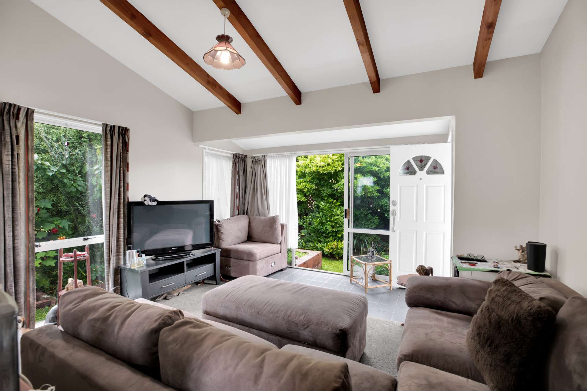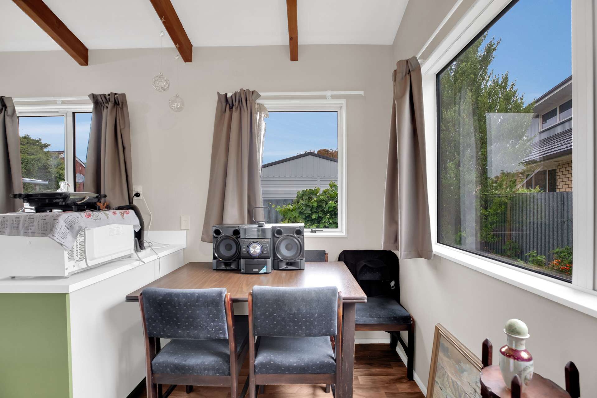 The open-plan living - flooded with natural light from large - double glazed windows through-out this home. Enhanced by cathedral ceiling - Oregon beams, that adds character and height. It flows seamlessly to the outdoors, offering easy access to a lovely, private backyard.