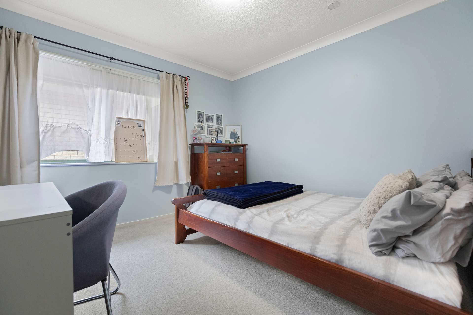 Off the garage, through a double-glazed sliding door, there’s a separate guest wing with a spacious living room, complete with a heat pump, bedroom, ensuite with shower and walk-in-robe. The kitchen cabinetry has soft close drawers and there’s a kitchen sink too. Wonderful for those who wish to have an extra person living with them, in their own peaceful and private space.