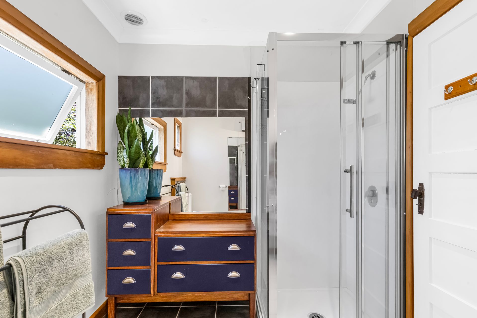 All three bedrooms open directly out to the deck, creating a strong connection to the outdoors and allowing each room to enjoy fresh air and the surrounding views. The bathroom is tidy and functional, in keeping with the age of the home.
