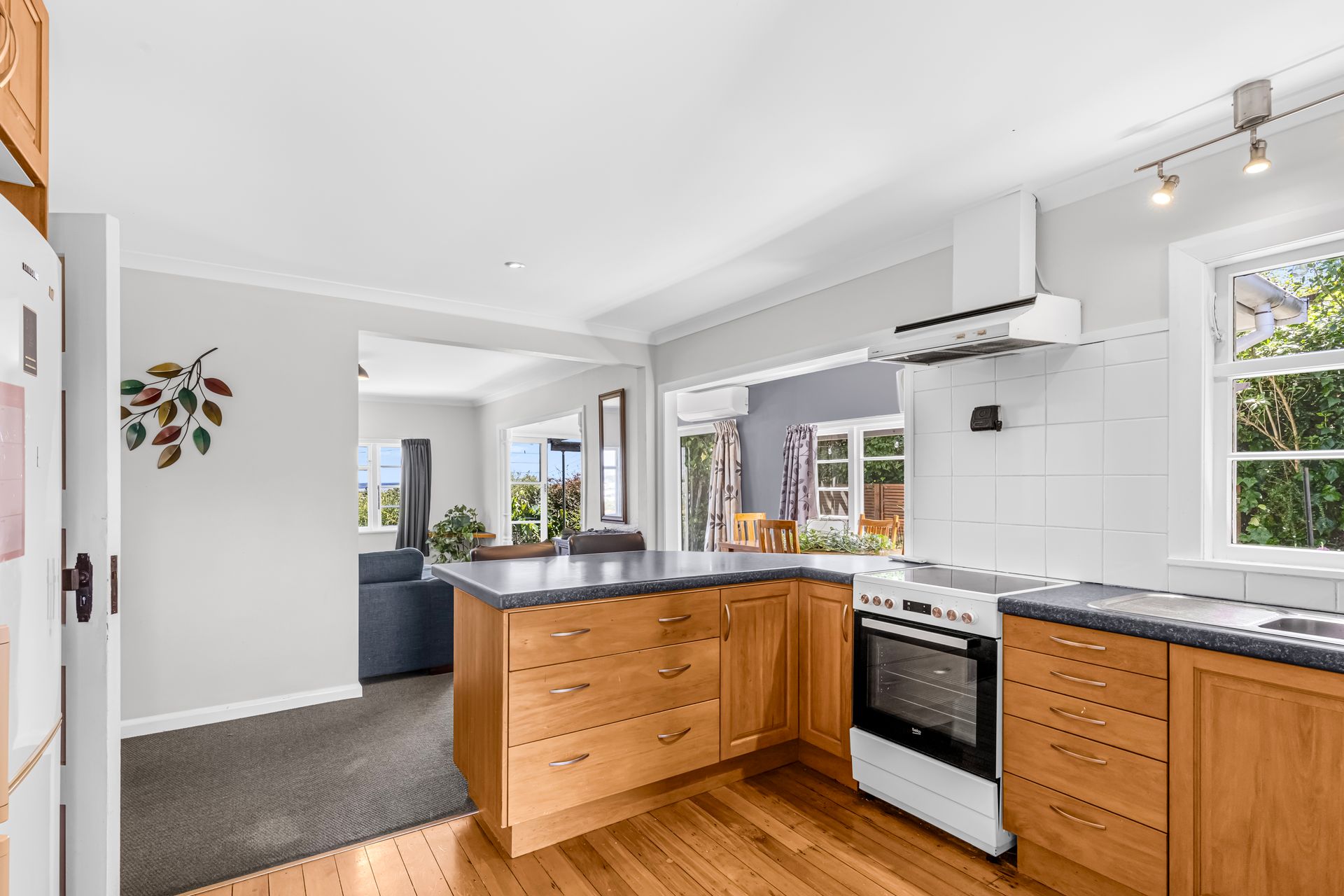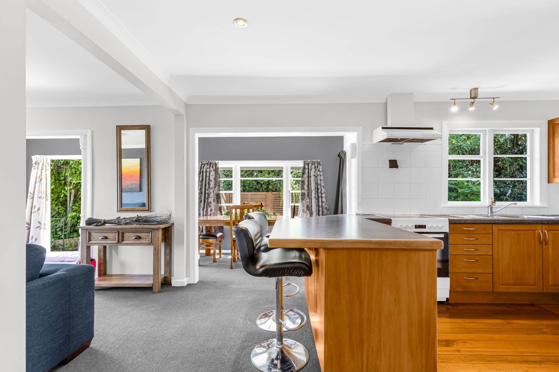The open plan kitchen, dining and living area forms the main living space of the home. The kitchen is practical and centrally positioned, flowing naturally into the dining area and through to the lounge. Natural light and the elevated outlook add to the sense of ease, creating a comfortable environment for everyday living.