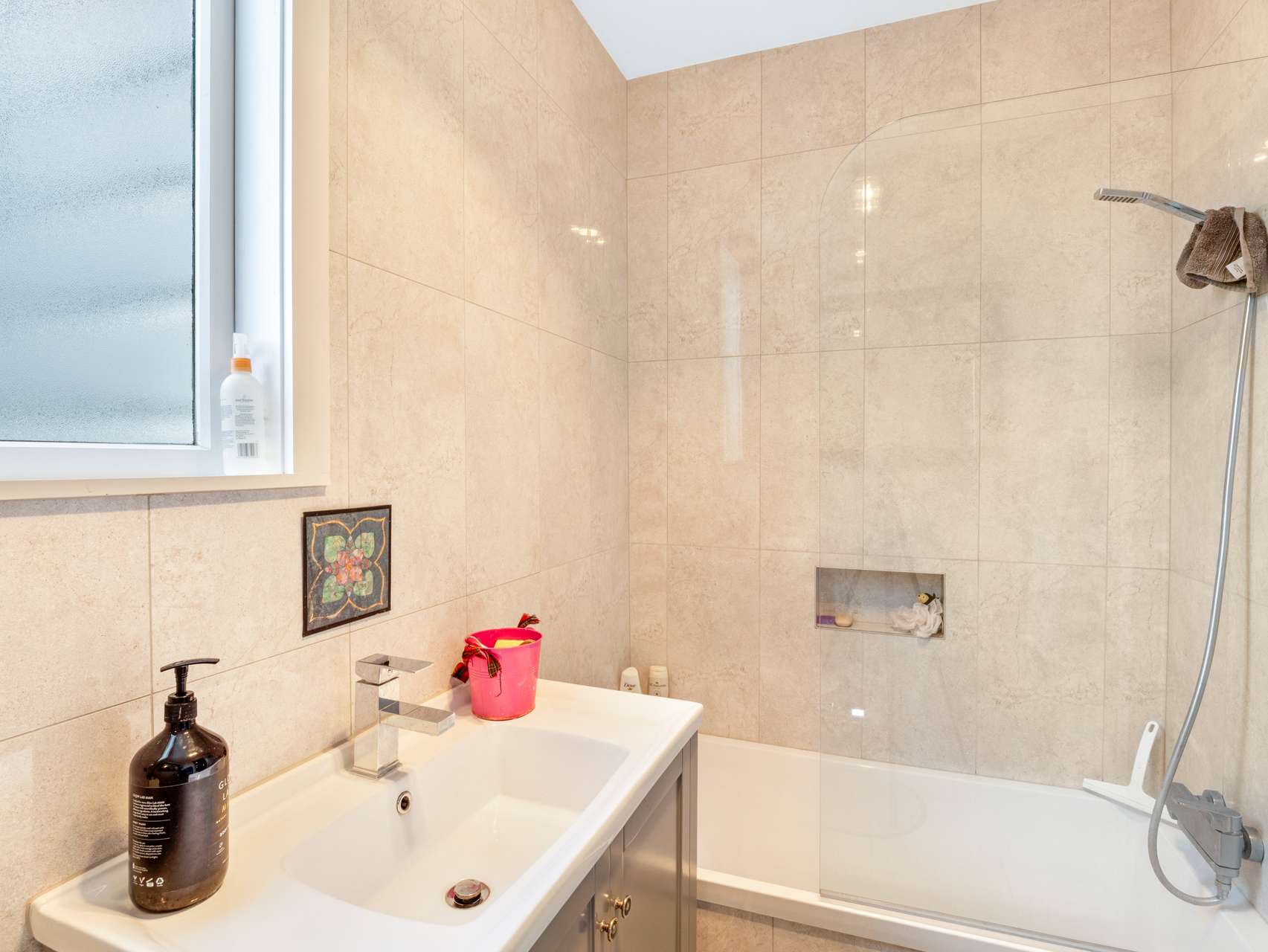 modern tiled bathroom/shower, an open-plan living/dining area with a sunny bay window