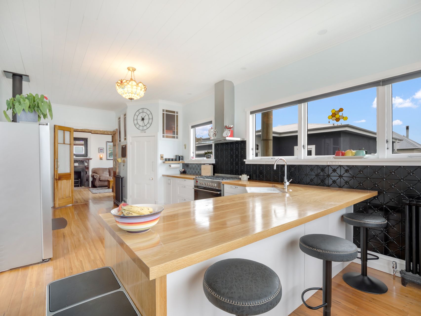 A generous lounge with timber floors, tall ceilings, leadlight detail and an ornate fireplace sets the tone, while the kitchen and dining area opens up as the everyday heart of the home, with a large island bench, excellent pantry storage and wide windows that attract the sun and views. It is easy to picture breakfast in the bay window, watching the everchanging sea visas.