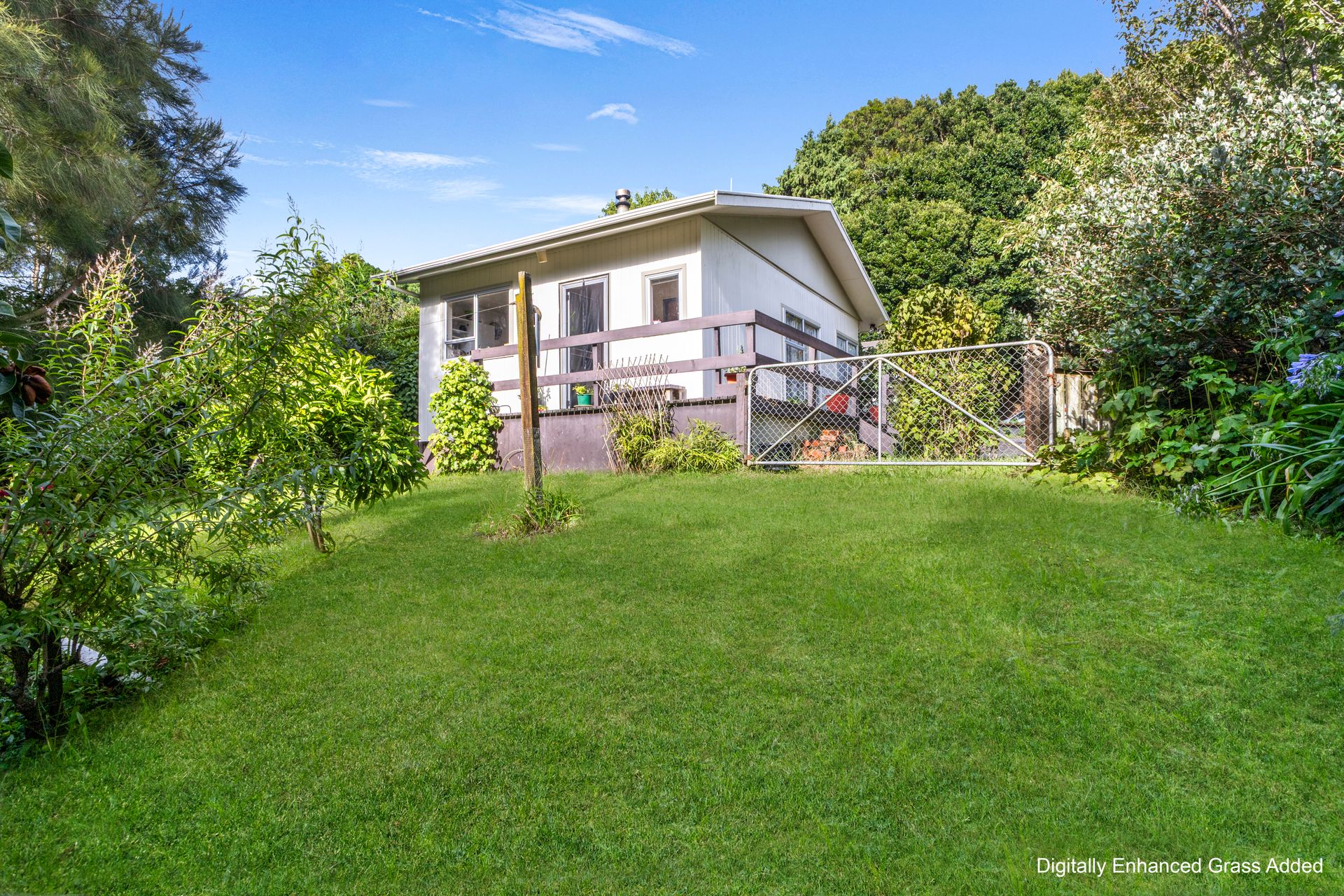 Outdoors, the wraparound deck provides easy indoor-outdoor flow and a sunny spot for morning coffee. Beyond, the expansive lawn and established trees create a private, green retreat with room to kick a ball, pitch a hammock or simply unwind. Mature planting and garden beds add colour and texture throughout the section.