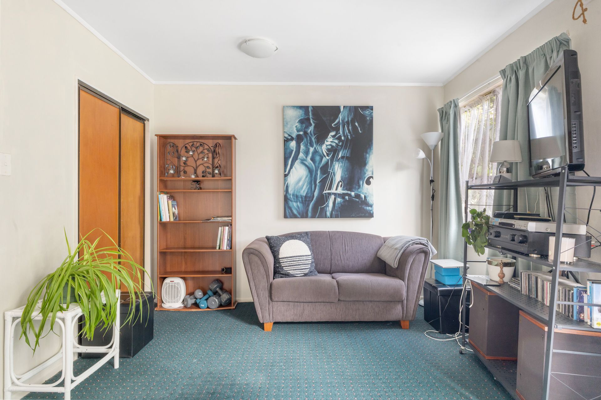 The kitchen itself is tidy and well laid out with shelving and a freestanding oven. Positioned beneath a large window, it enjoys leafy green outlooks that make everyday cooking feel a little more relaxed. The bedroom is softly styled with good natural light, while the bathroom includes a shower, vanity and toilet in a clean configuration. A separate laundry area adds everyday convenience.