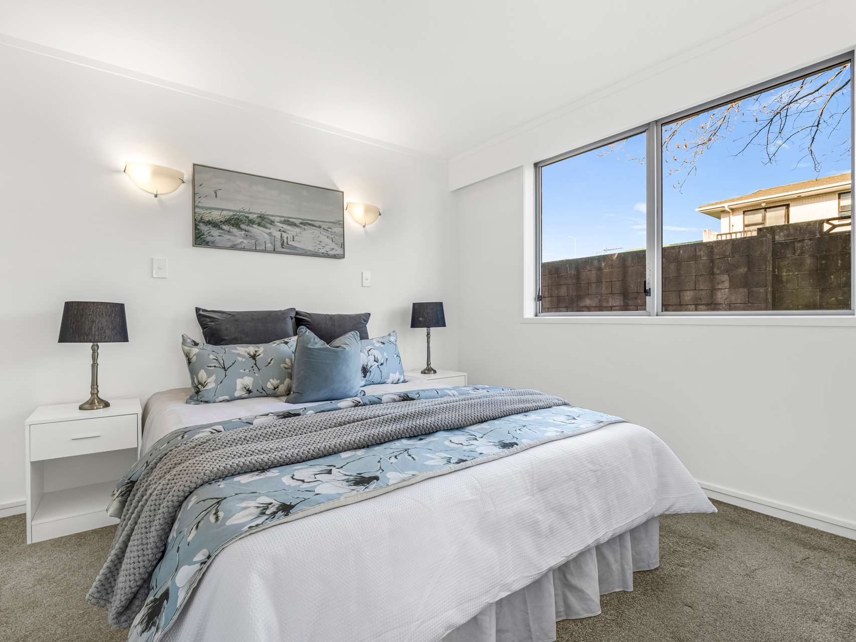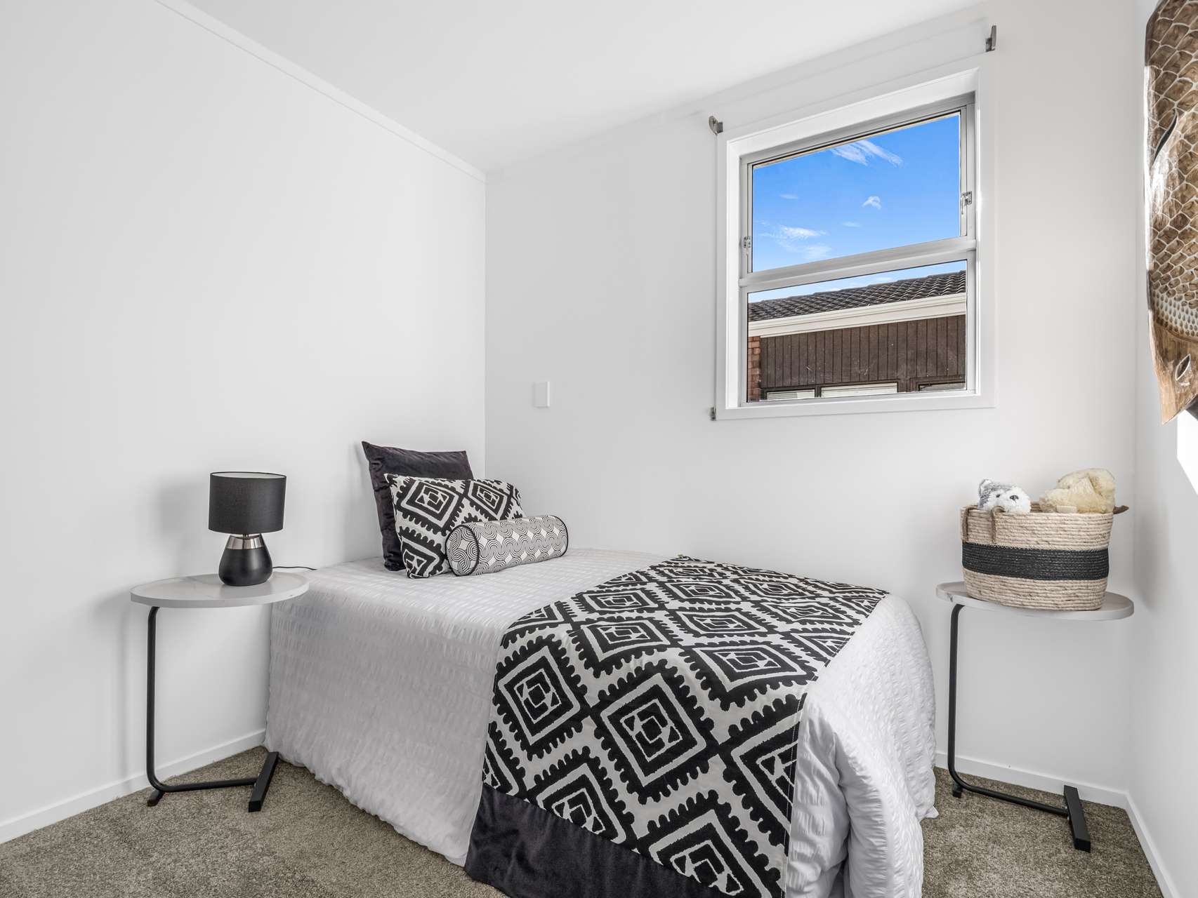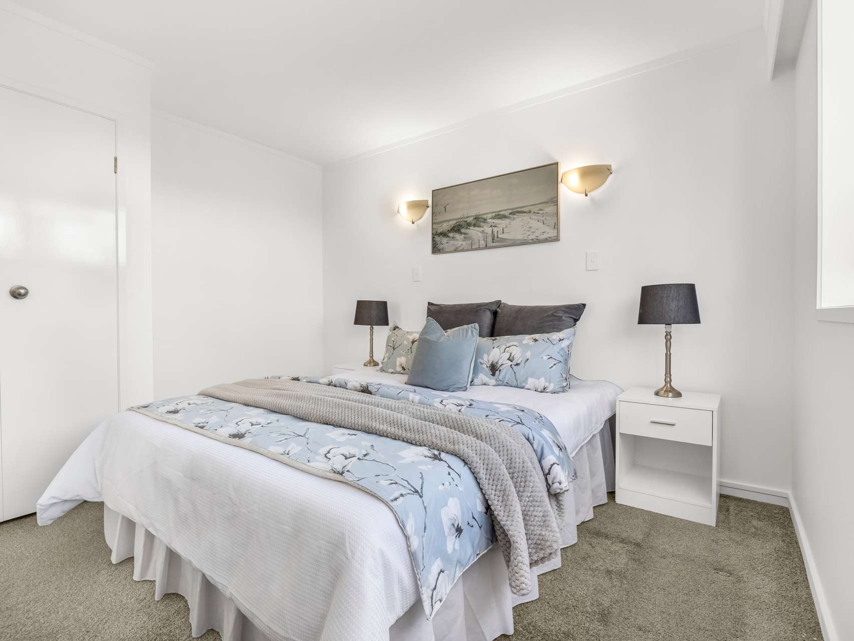 Inside, light bounces off crisp white walls, keeping the interiors bright and open. The living area feels warm underfoot with its wood-toned flooring, while the bedrooms are finished in a darker carpet for comfort and calm.