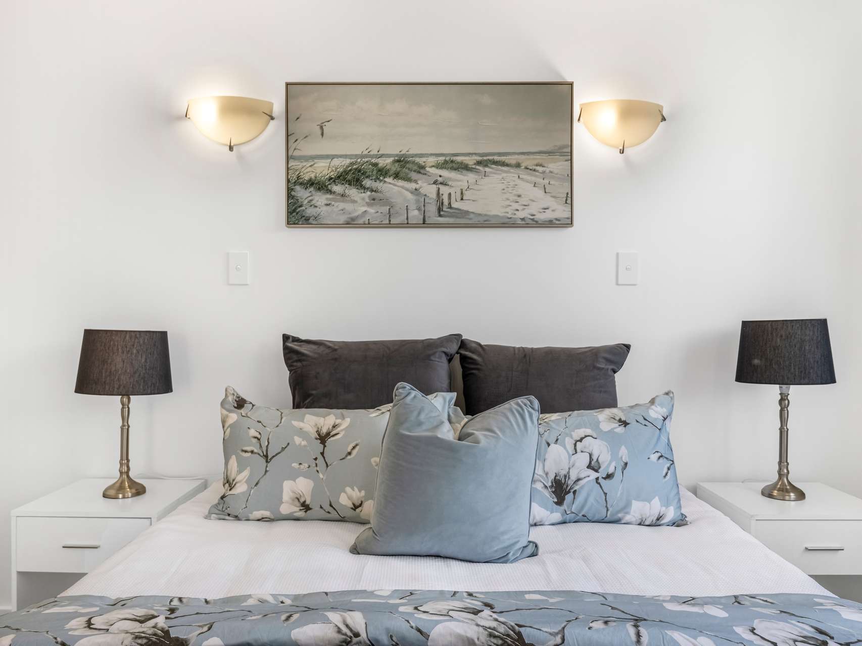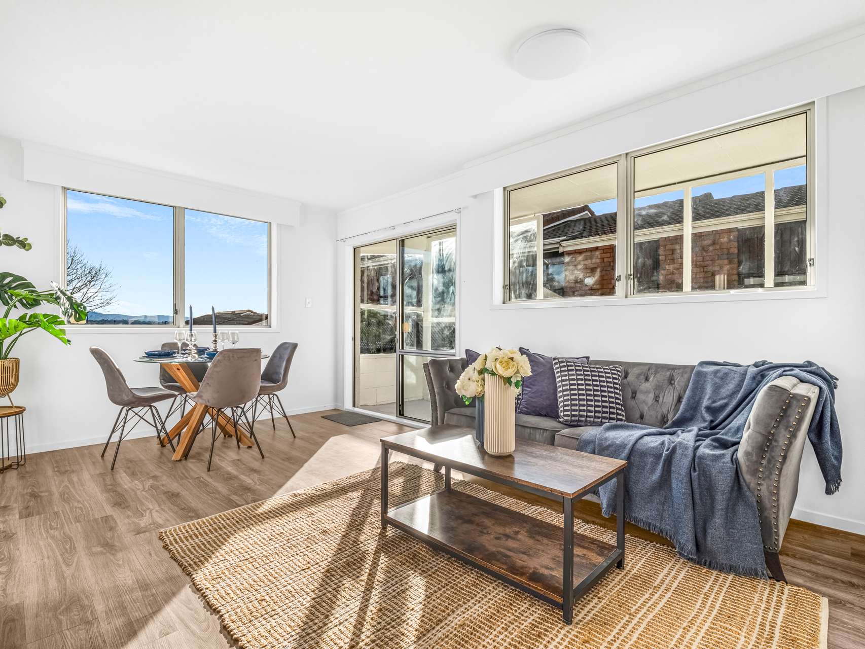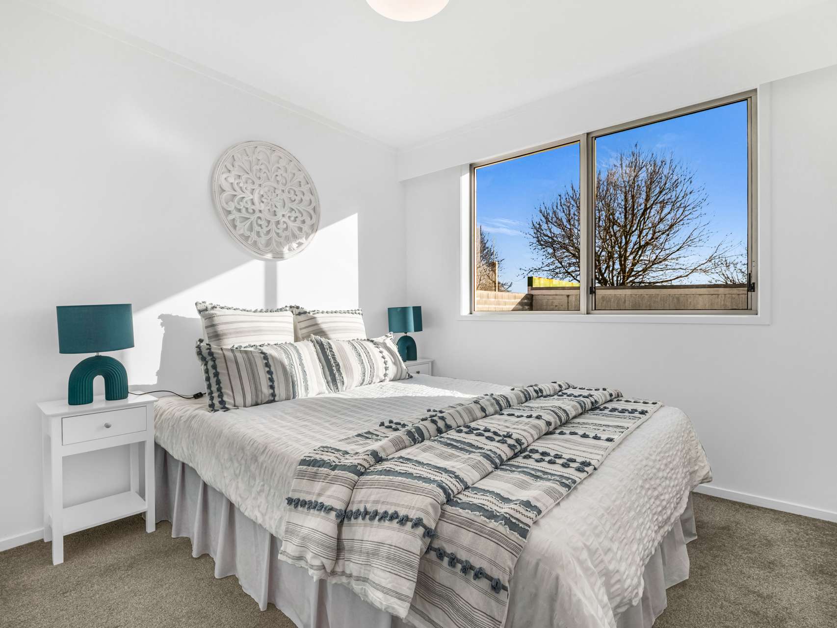 Inside, light bounces off crisp white walls, keeping the interiors bright and open. The living area feels warm underfoot with its wood-toned flooring, while the bedrooms are finished in a darker carpet for comfort and calm.