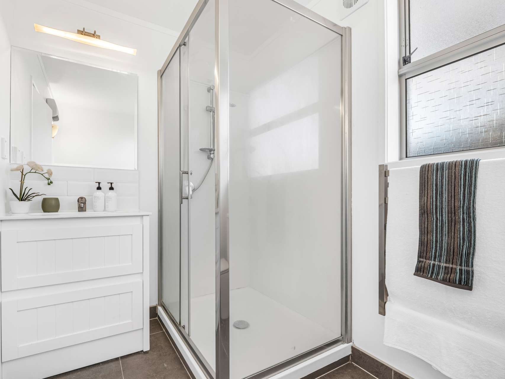 The kitchen continues the clean, minimal theme with white cabinetry, a smooth bench top, and just enough space to move with ease. In the living and dining area, deep charcoal-grey furnishings add contrast, creating balance and warmth. The bathroom mirrors the same fresh approach—white tiles and fittings set against a dark tiled floor for a touch of quiet sophistication.
