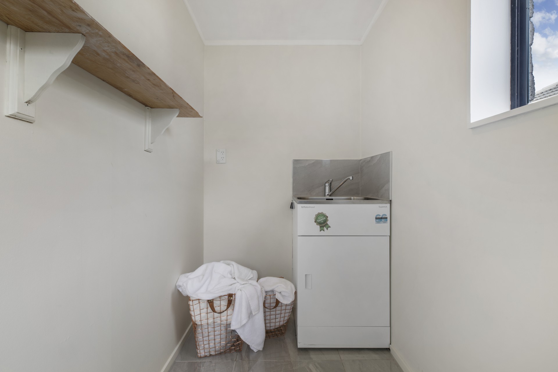 The bathroom has been modernised and features stunning tiled walls, with separate toilet. There is even a laundry room on the side of the house with a built-in sink.
