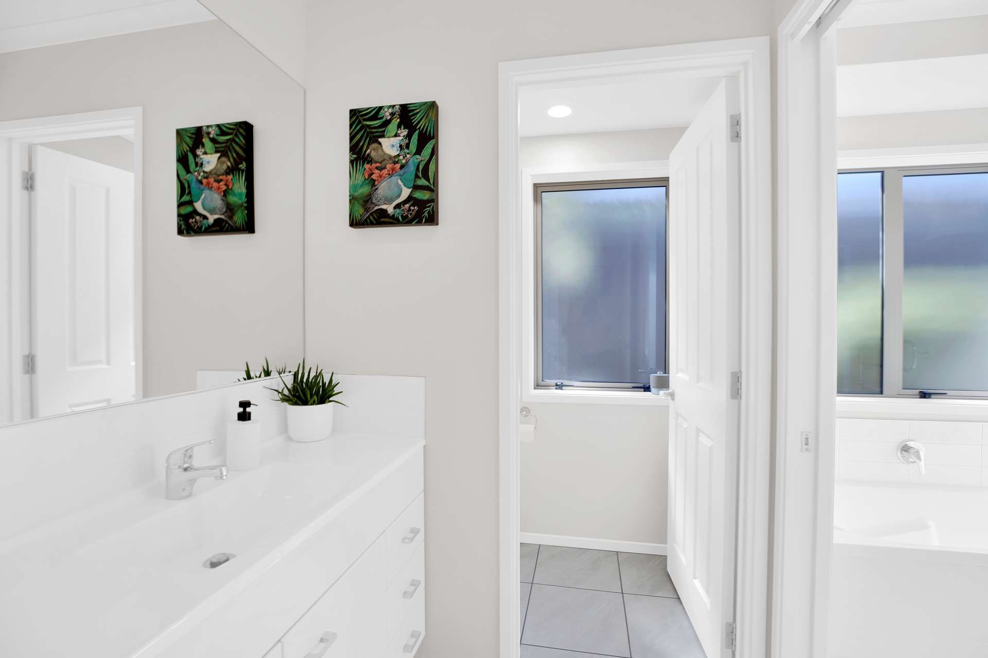 Fresh and modern, the family bathroom contains a relaxing bathtub, shower, vanity and toilet.