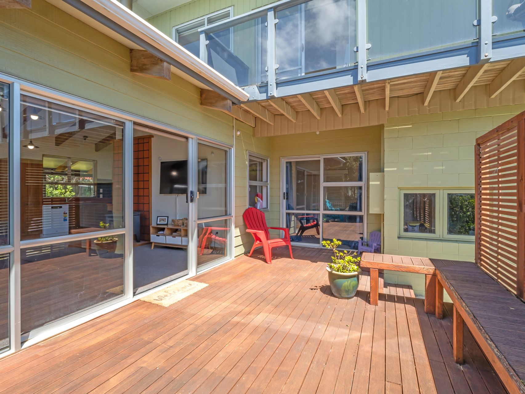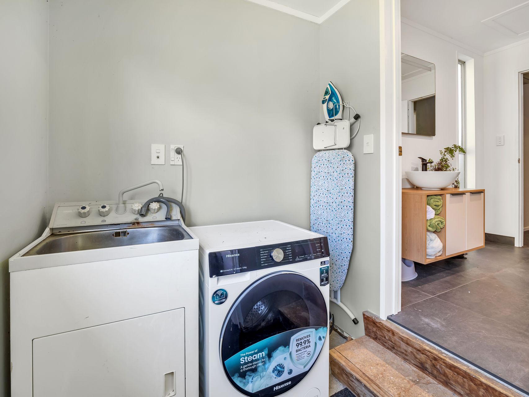Two bedrooms sit on this level - one with direct patio access and leafy outlooks, the other ideal for kids or guests. There is a separate laundry and generous storage to hide all the beach gear.