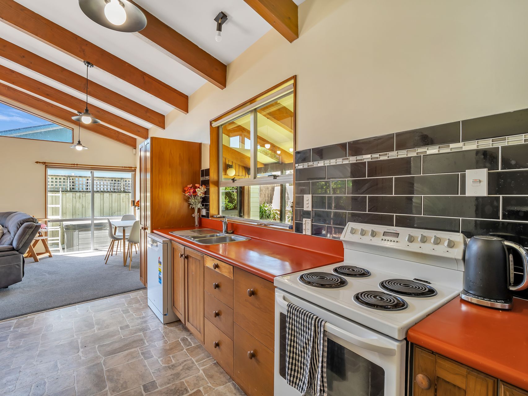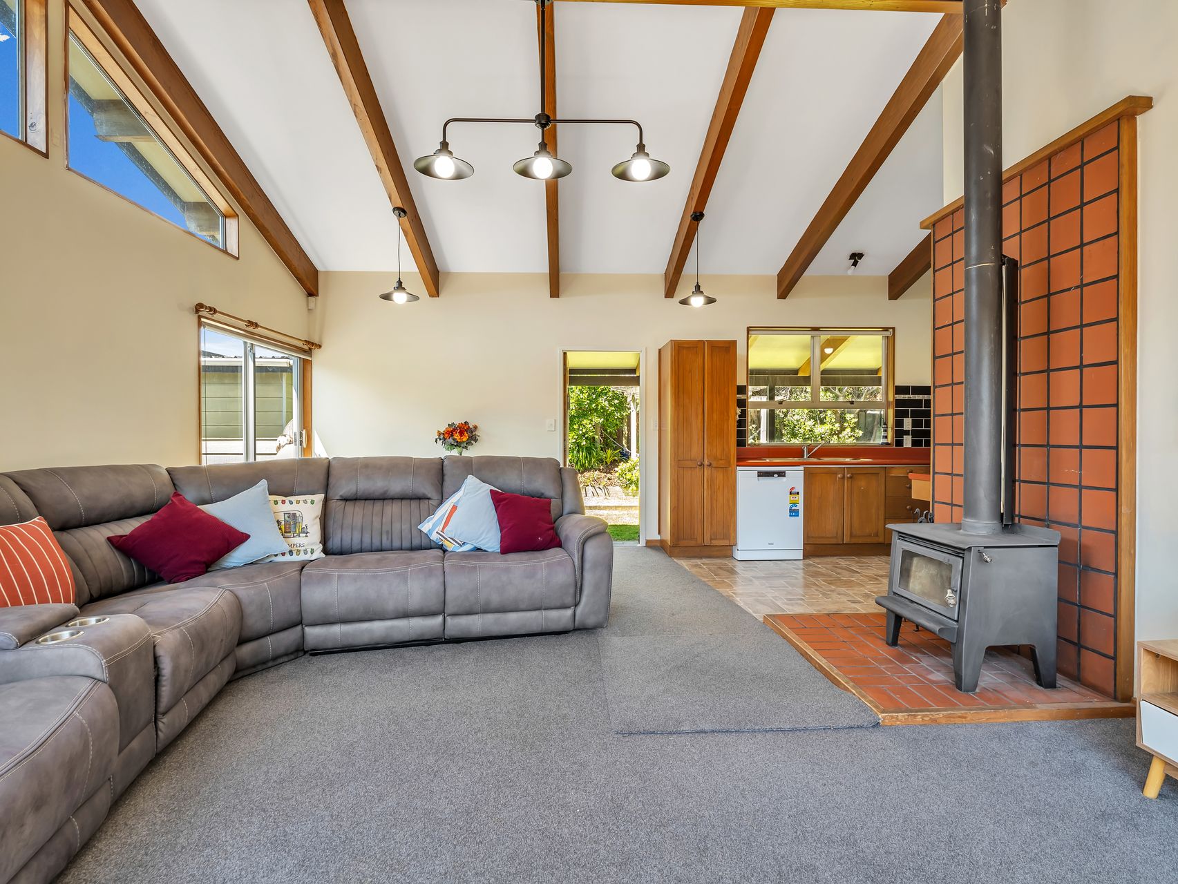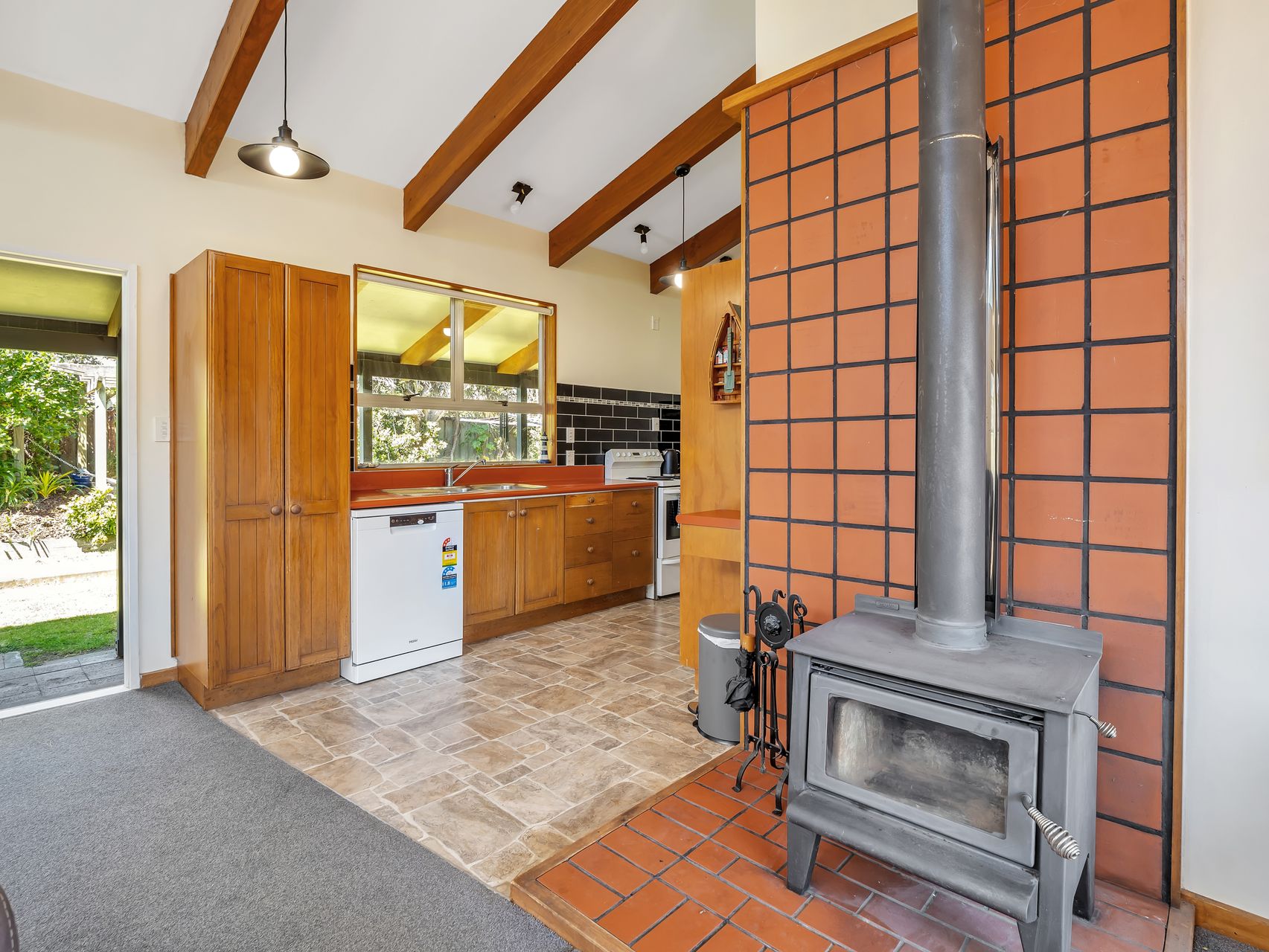 Inside, the ground floor is your social hub: open-plan living, dining and kitchen under exposed beams, anchored by a wood-burning stove for cosy winter weekends. The kitchen keeps it honest with warm timber cabinetry, tiled splashback, great storage, and it spills out to a sunny deck for long lunches and evening BBQs. Slide open the doors from the lounge and you’re on a larger entertaining deck with built-in seating, while a covered patio and fenced garden give you year-round outdoor options.