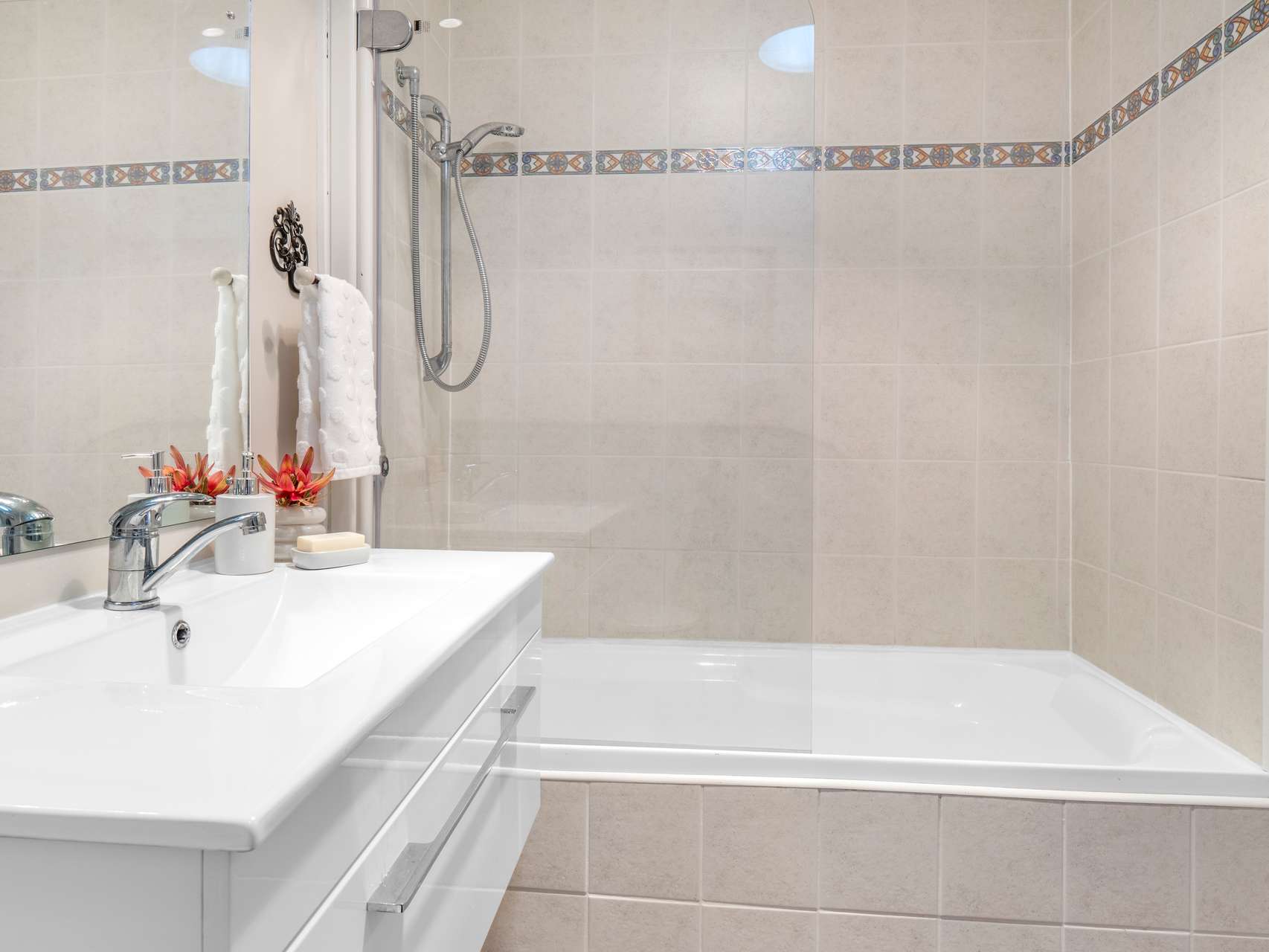 Each of the three bedrooms has its own personality: one framed by a bay window complete with double glazing that welcomes the morning light, another with playful floral charm, and a third that offers calm simplicity, making it well suited as a study or guest retreat. The main bathroom is classic with a full-sized bath and overhead shower, while a second smaller bathroom adds everyday convenience.