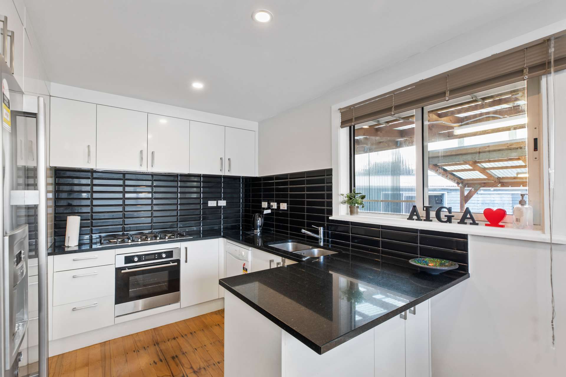 Newly renovated with a bold black and white colour palette the new kitchen is simply spectacular. It has gorgeous modern appliances, clean lines, sleek black subway tiles and a bold black bench top. The crisp white, modern cabinetry contrasts nicely with the black - it’s functional and stylish room.