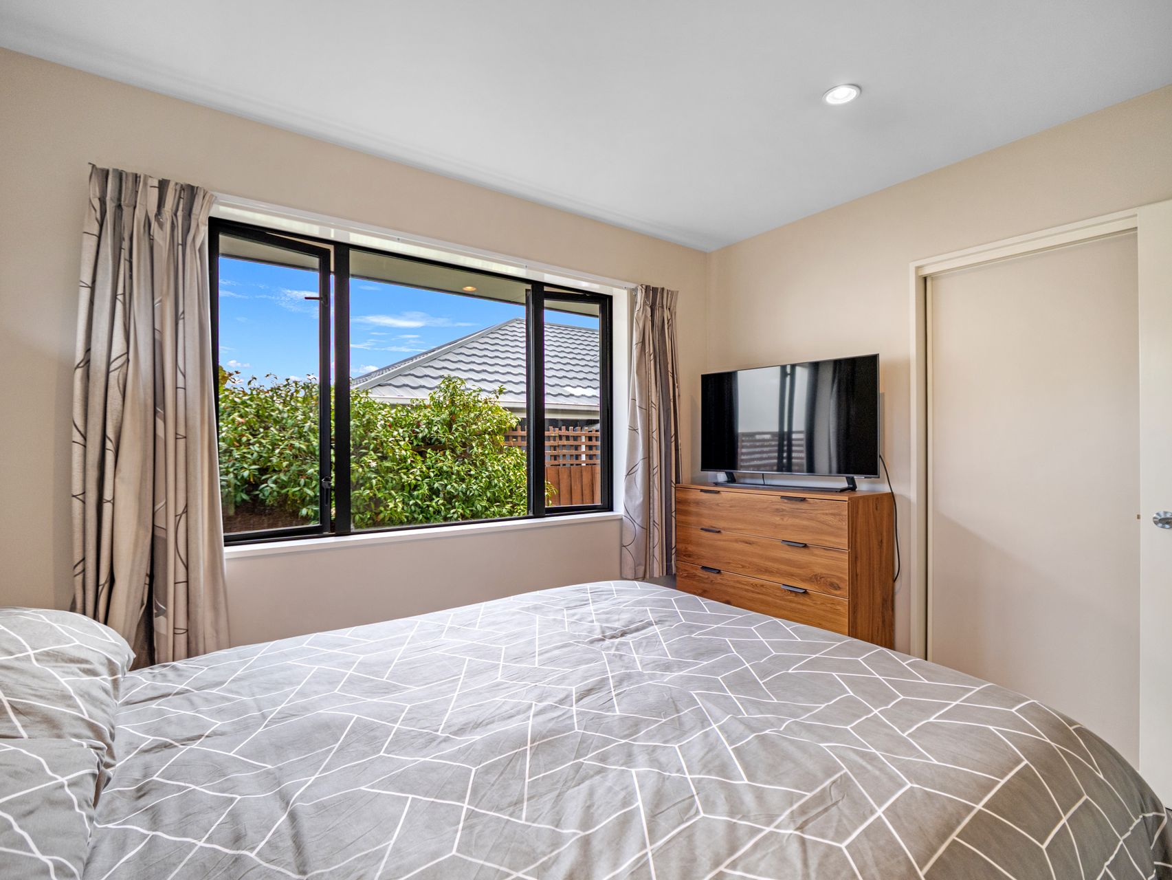 The home is positioned to soak up all-day sun, with the wide windows and neutral walls only adding to the bright, welcoming feel. Open-plan living gives you flexibility, with the kitchen and lounge flowing together and opening directly to a private patio, making everyday living and entertaining feel effortless. The living area easily accommodates both lounge furniture and a small dining table, keeping the layout cosy. A heat pump keeps you comfortable throughout the year.