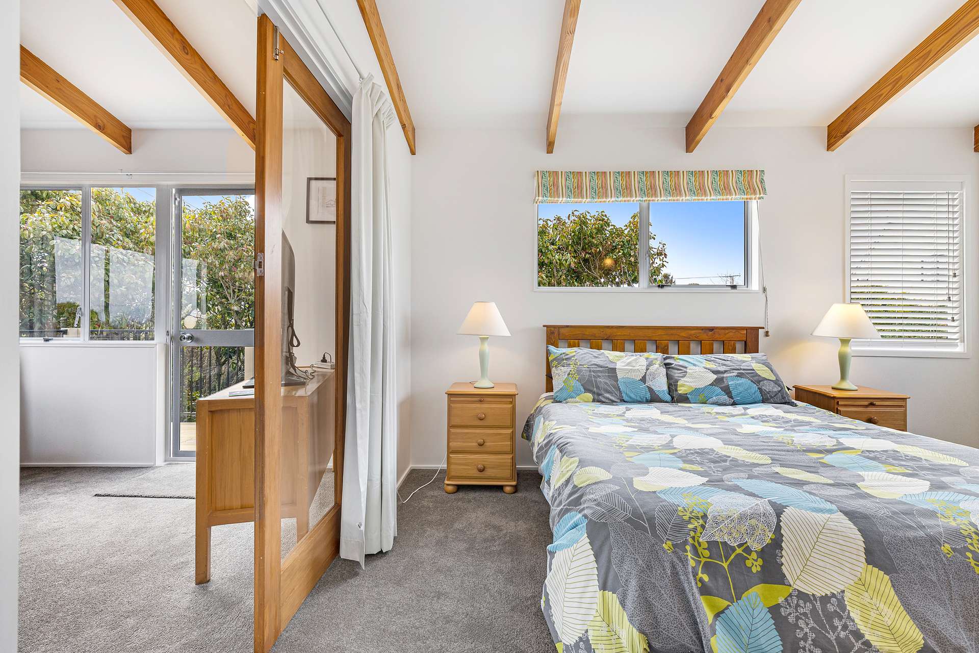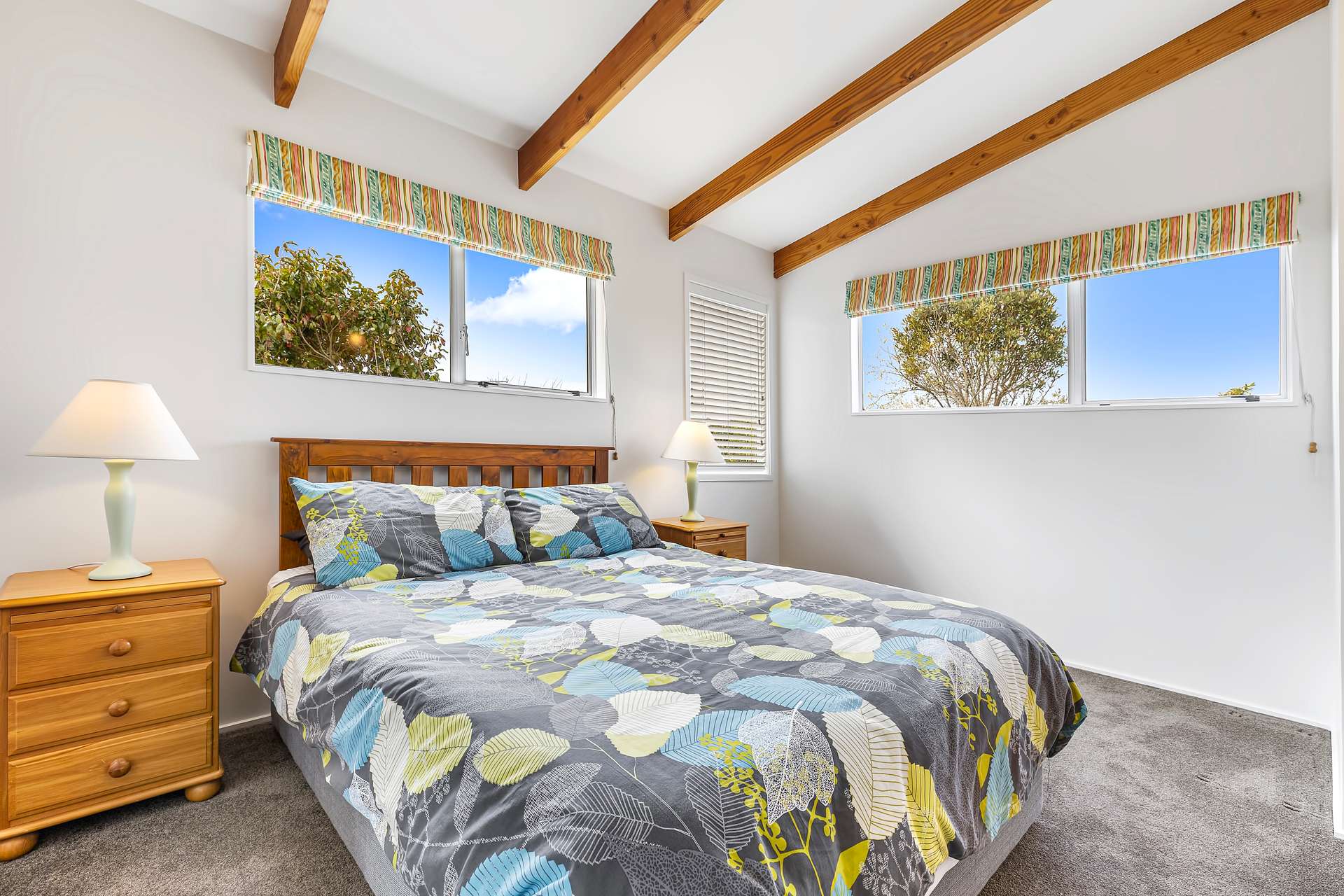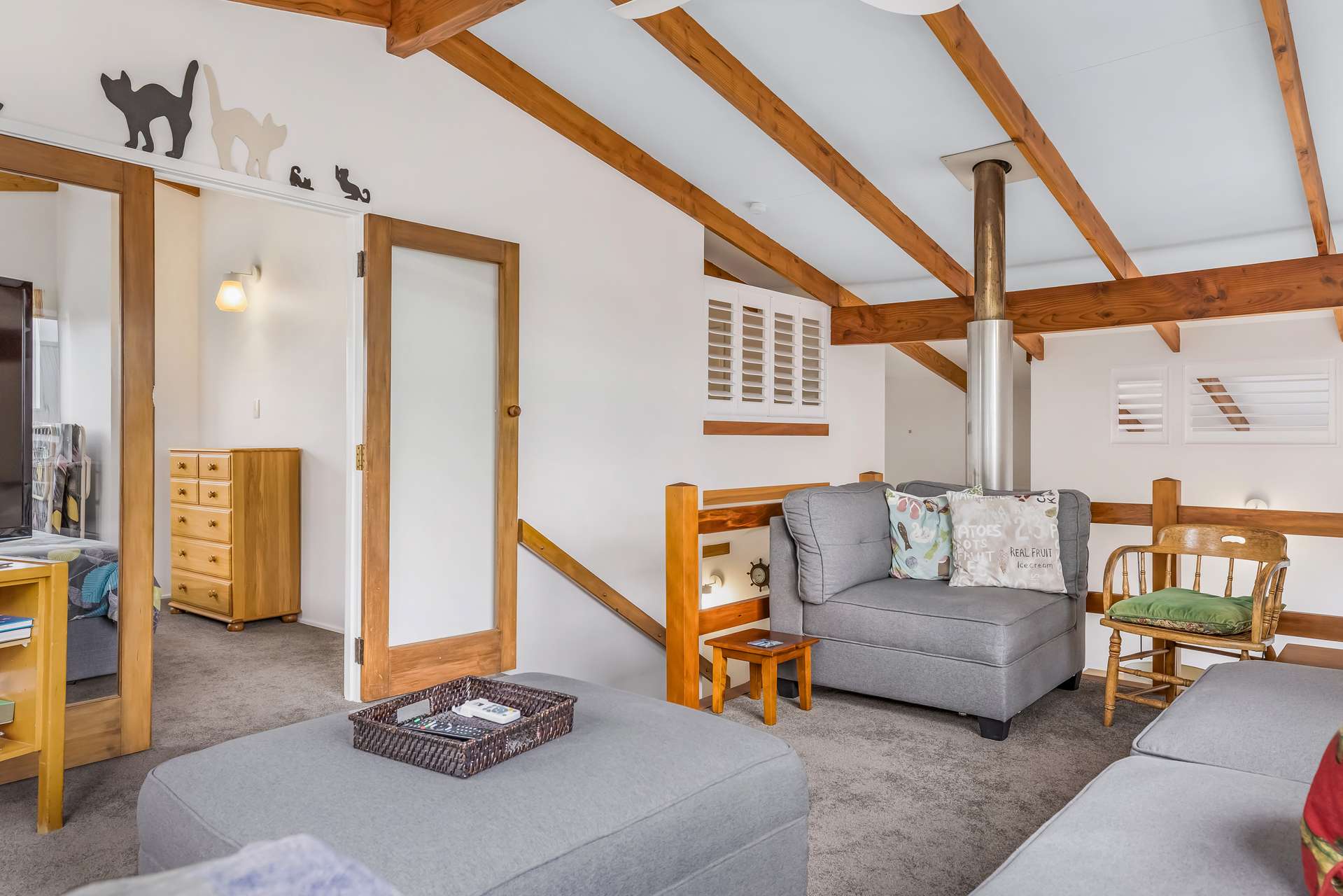 Living spaces allow you to follow the light. Vinyl floors run throughout, adding easy care and warmth to the kitchen/dining area. A carpeted staircase leads up to a compact but comfortable lounge and the main bedroom, all under raked ceilings with those signature beams, and from here a balcony serves up the views across to the lake.