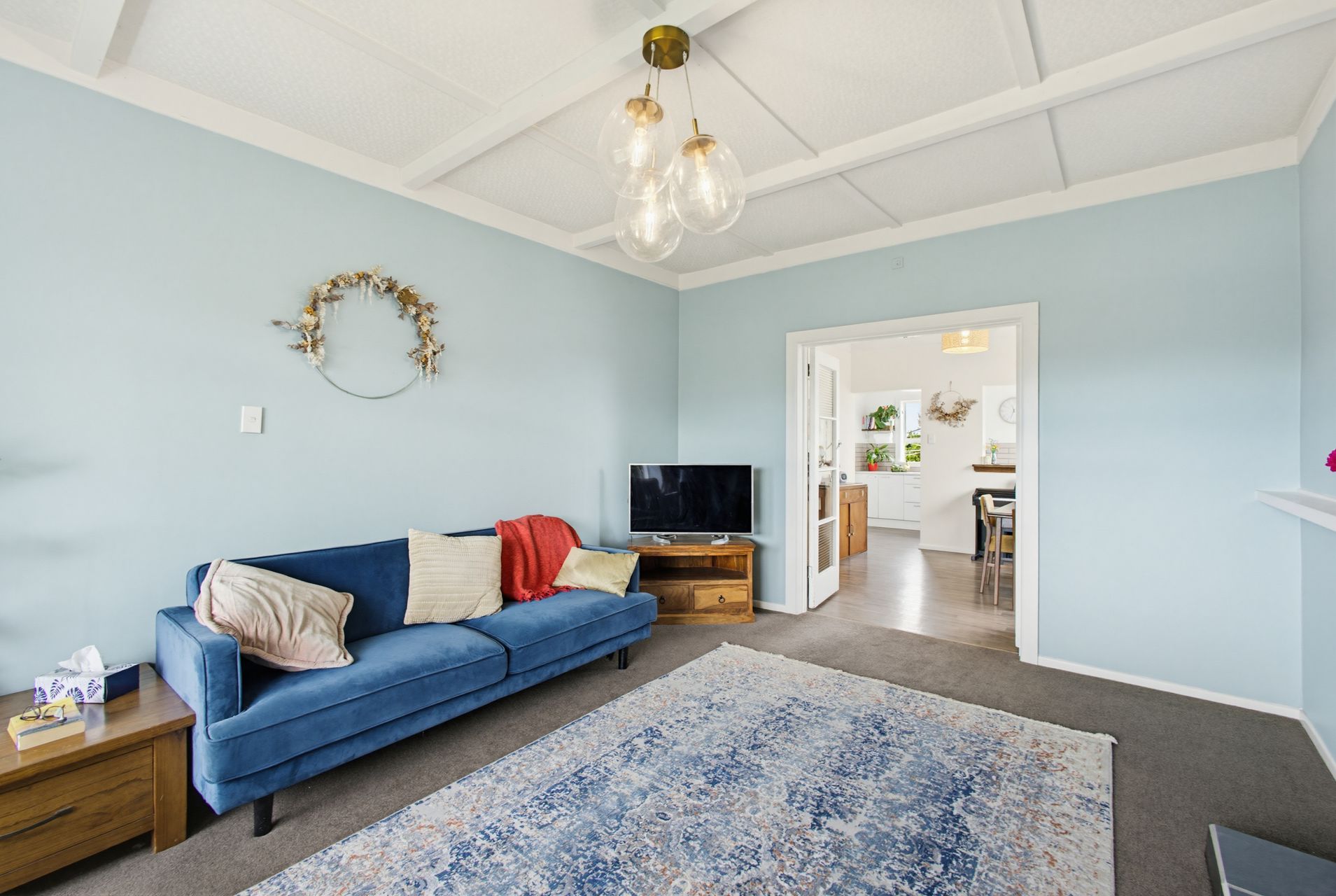 The lounge has a lived-in warmth with a coffered ceiling, broad picture window and wood burner giving the room real presence. Soft blue walls and garden outlooks keep it calm, while the separate dining room catches the light . In the kitchen, long benches, good storage and a pass-through window make everyday routines feel connected, whether it is toast and coffee in the morning or dinner simmering in the background.
