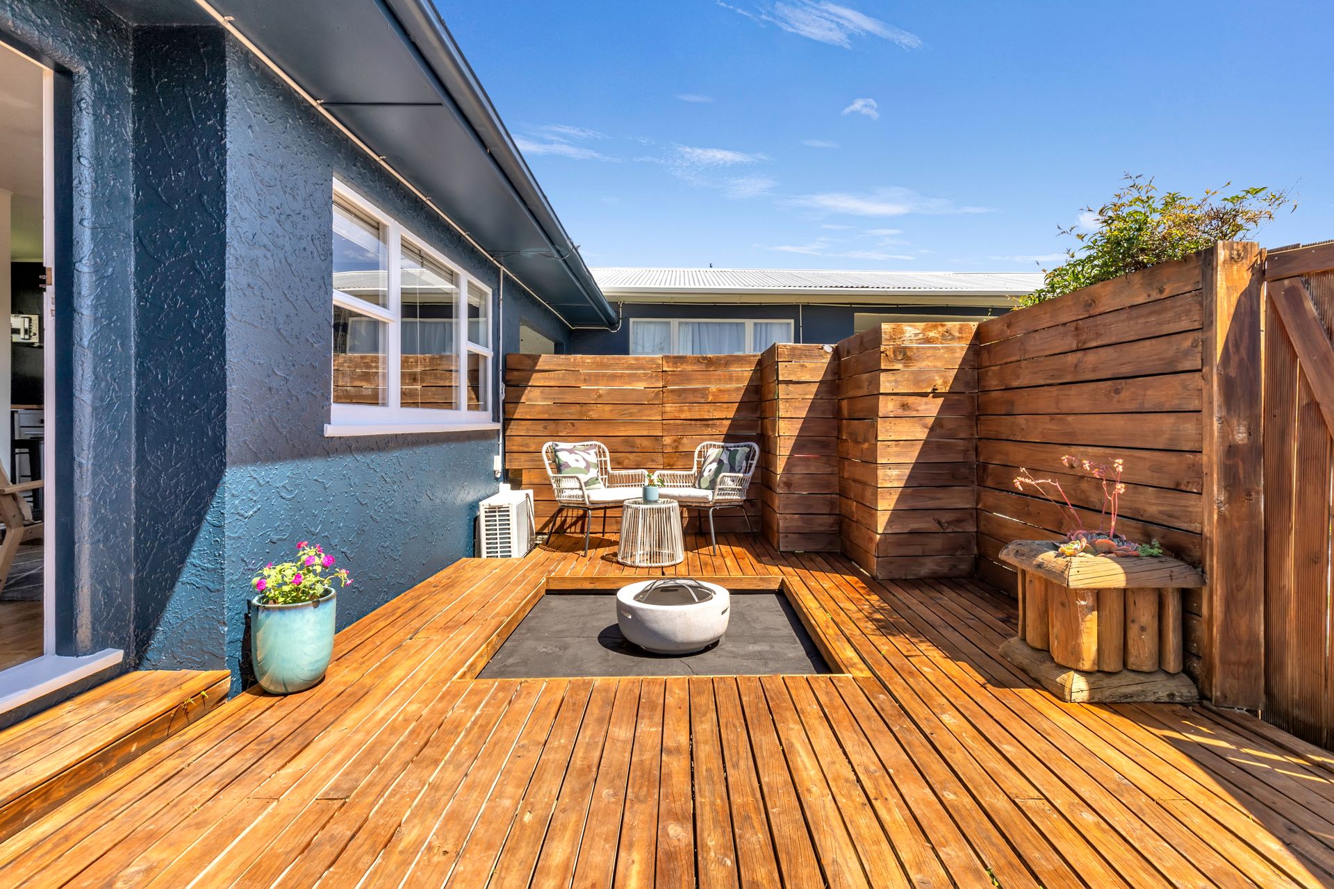 Inside, the home carries a warm, modern-character feel. Original timber flooring adds natural texture and personality, giving the interior authenticity and charm. The living space feels comfortable and welcoming, flowing out to a small, sun-drenched front courtyard with a built-in firepit that creates a sheltered entertaining nook, a perfect place for a morning coffee or relaxing in the afternoon sun.