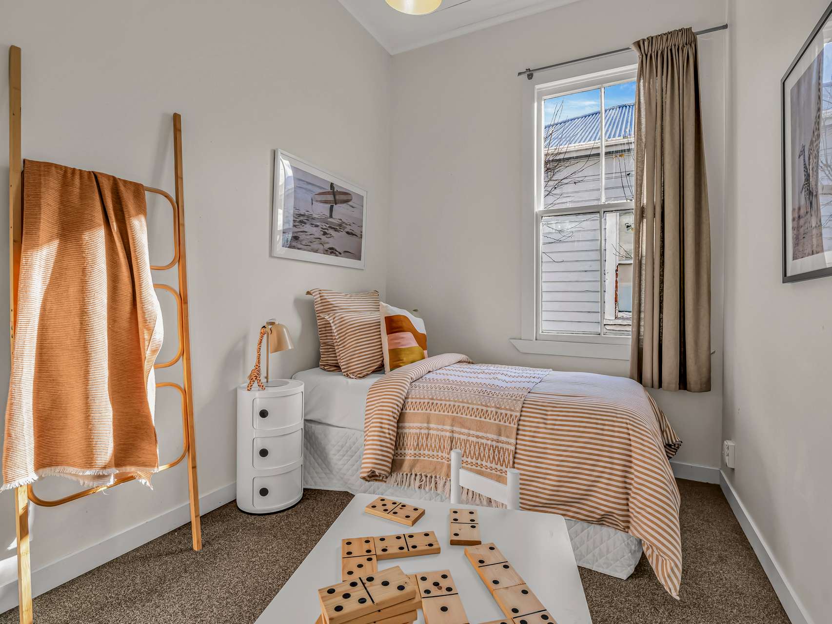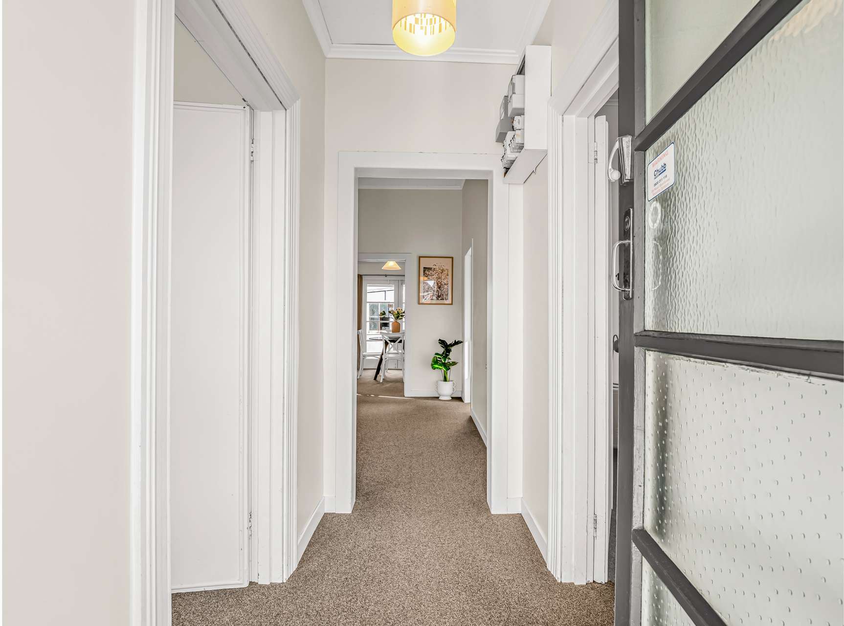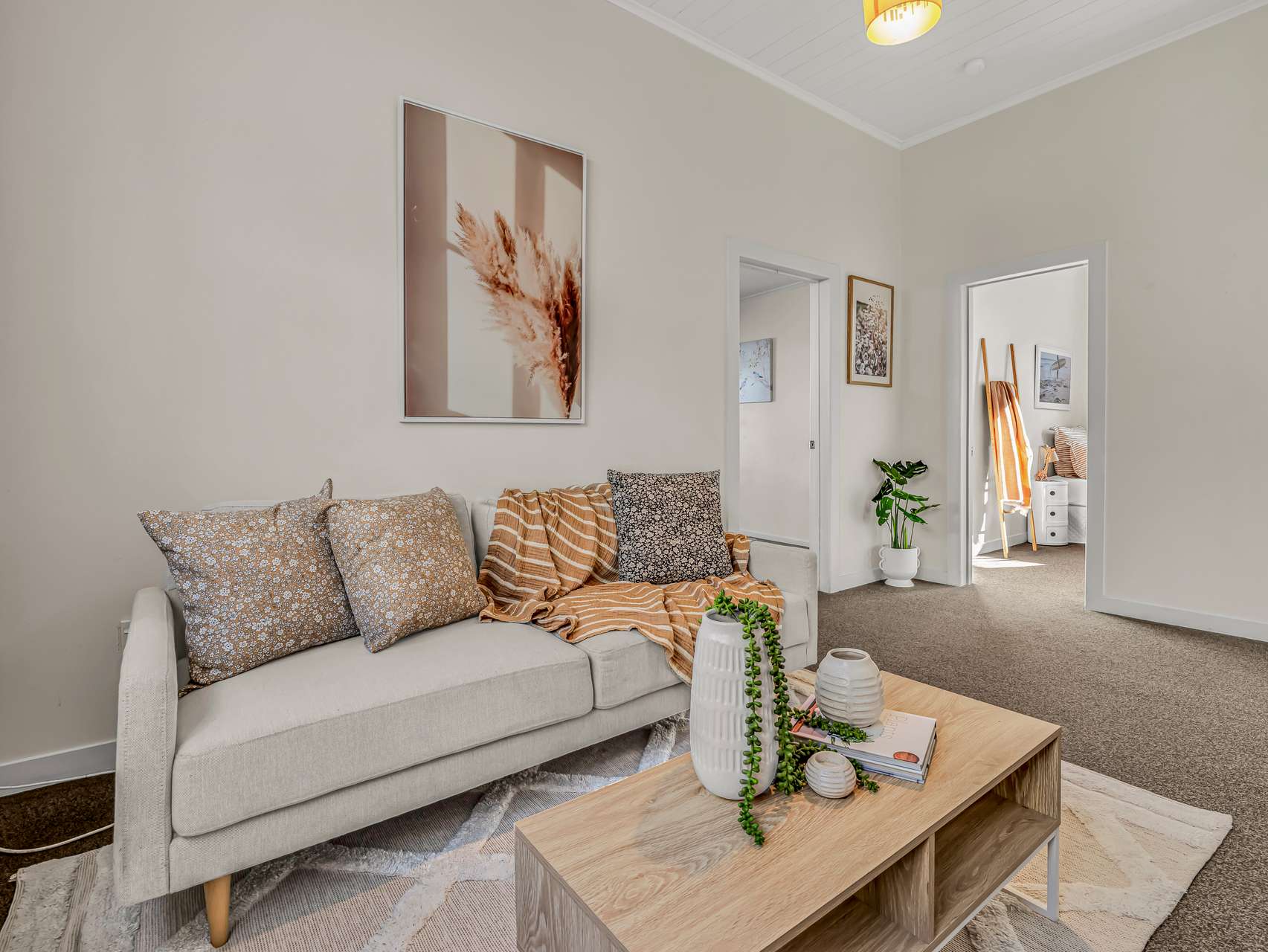 You’re welcomed in via a new front porch and then the central hallway, with two bedrooms off either side that are sunny, quiet, and a good size for couples, flatmates or the spare-room setup. The third bedroom sits off the living, offering options for a home office or a light-filled retreat for guests.
