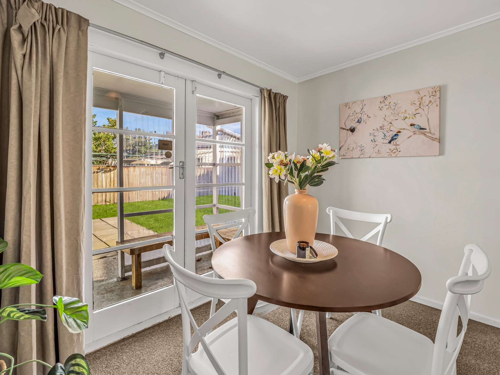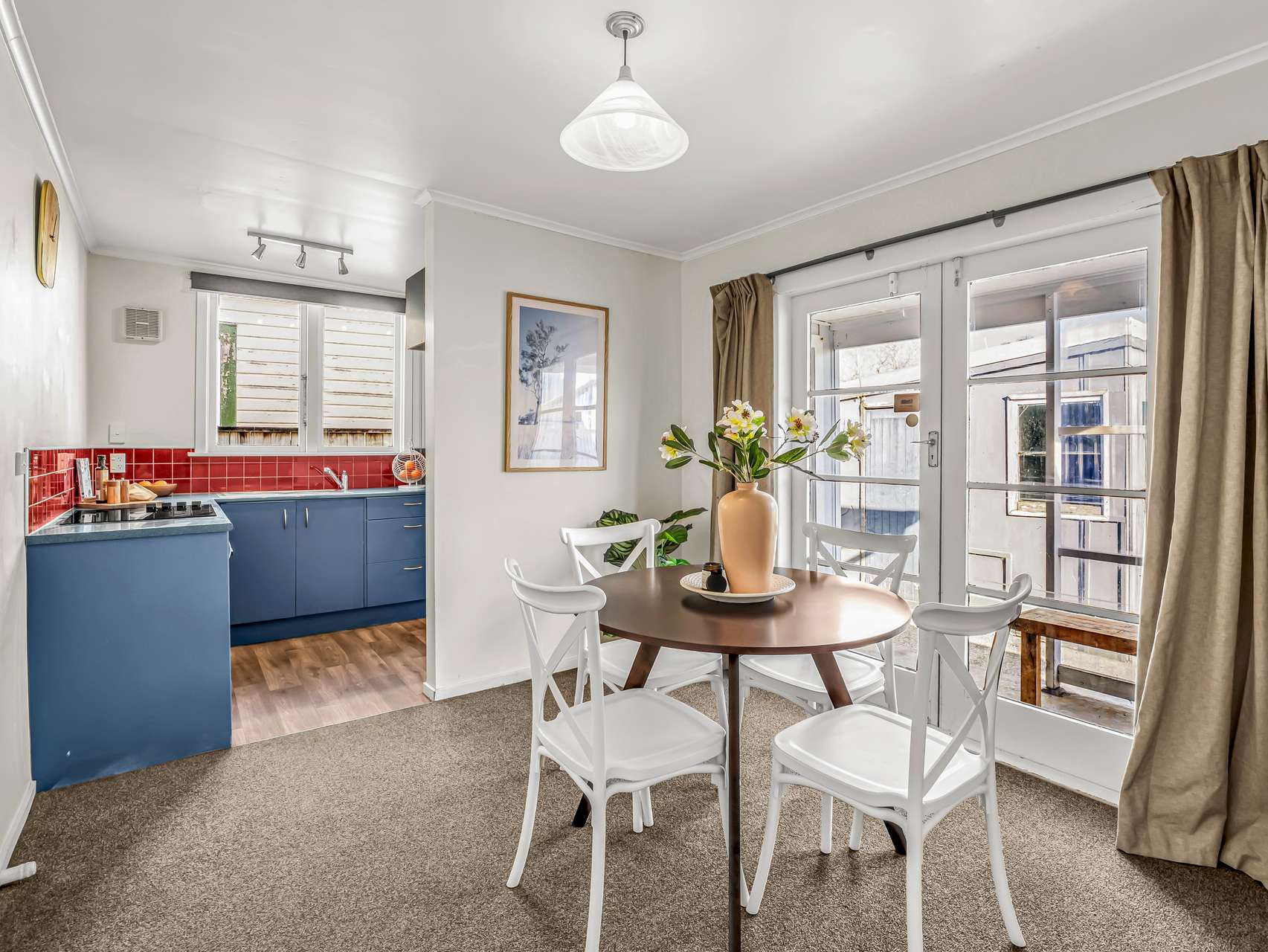 The living room is relaxed with a heat pump for warmth, flowing through to a dedicated dining area and a compact but well-laid-out kitchen with electric cooktop, pantry, and good storage.