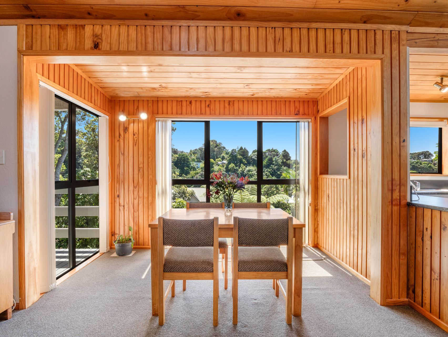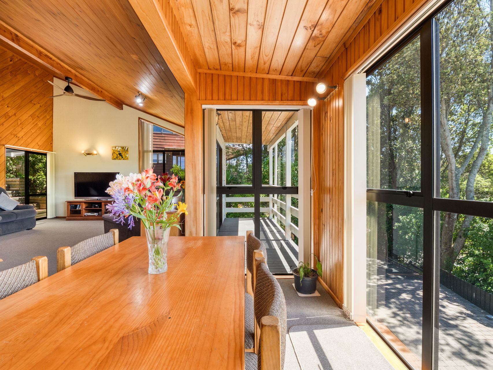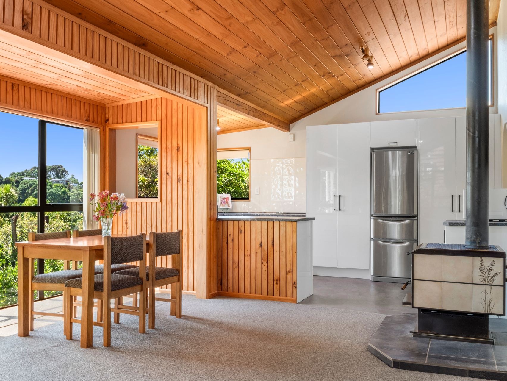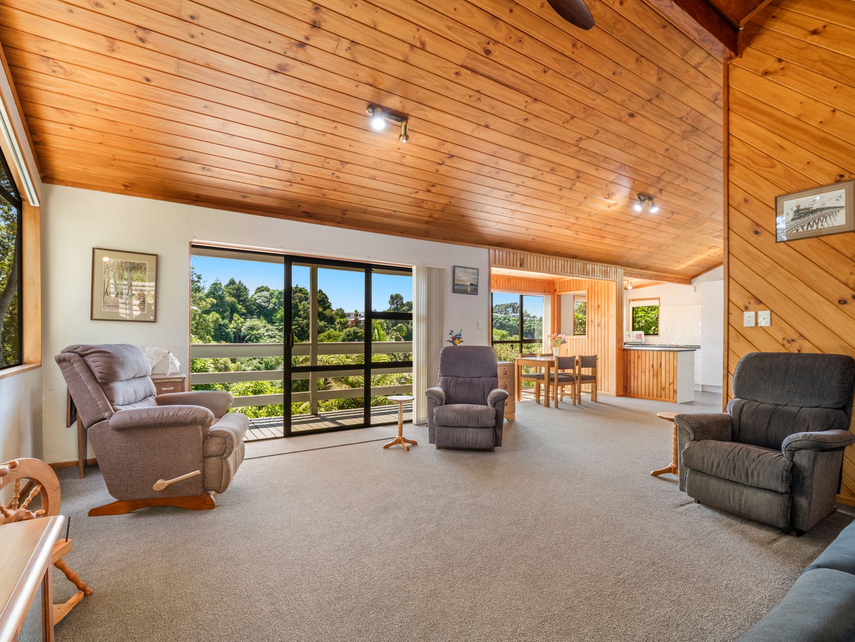 The design is both unique and thoughtful, blending character features with modern updates. Elevated living spaces capture beautiful bush views, with birdsong providing a constant and enchanting backdrop. Tui and wood pigeon are frequent visitors, adding to the sense of connection with nature.