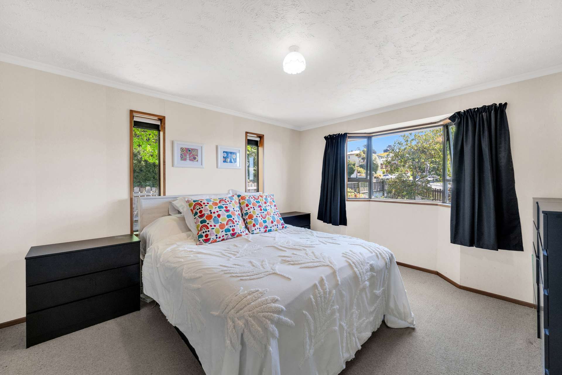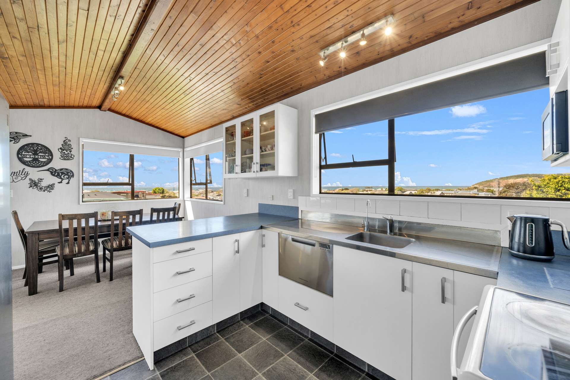 Upstairs, the open-plan kitchen, dining, and lounge area captures all-day sun and enjoys elevated views across town and out to the harbour. Three well-proportioned bedrooms, an updated family bathroom, and a separate toilet ensure modern living comfort for the whole family.