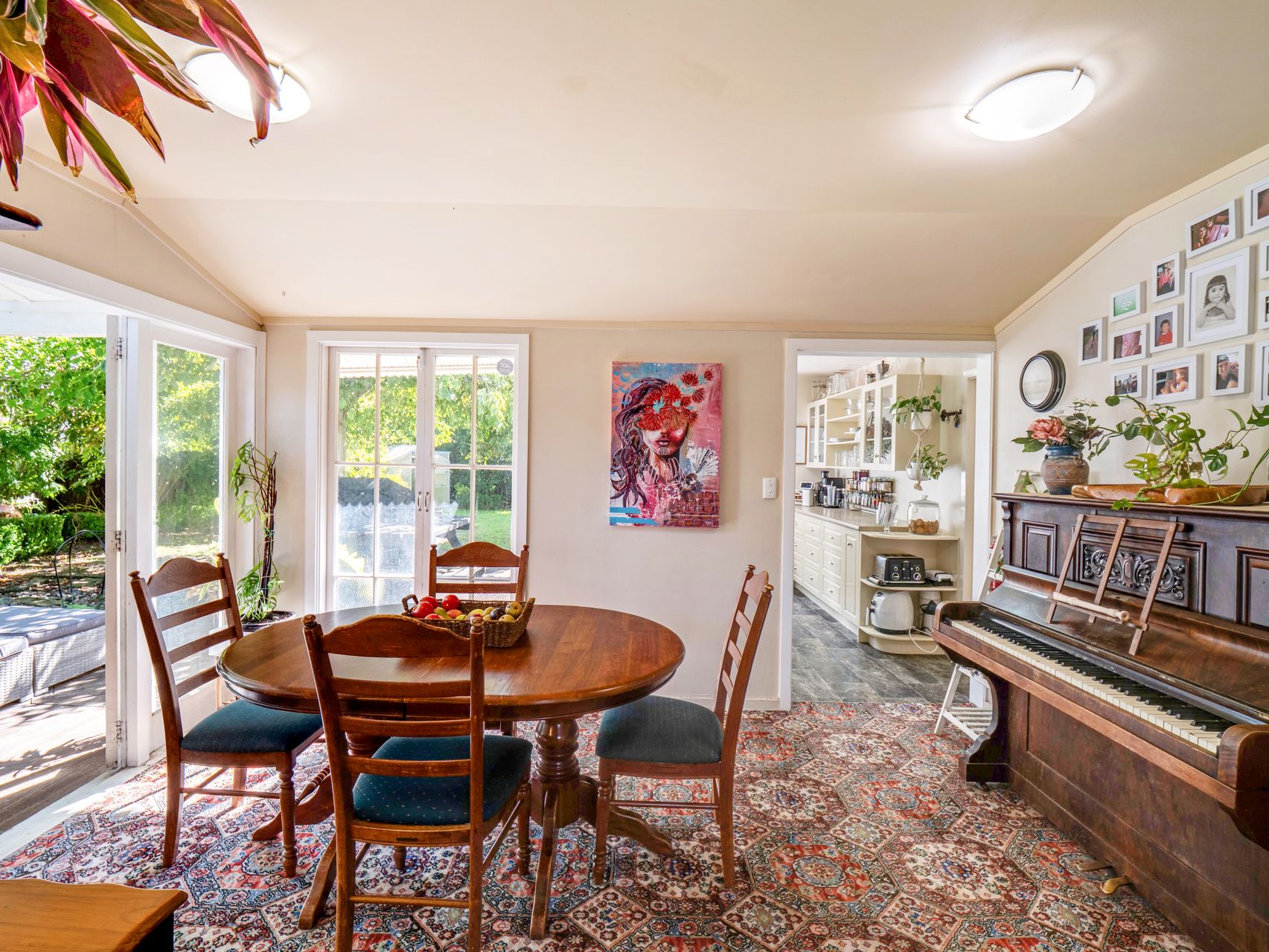 The living room is generous and welcoming, anchored by a wood burner for cosy winters and supported by a heat pump for year-round comfort. Large windows bring in natural light, while the dining area connects easily to both the kitchen and the outdoor patio through two sets of French doors.