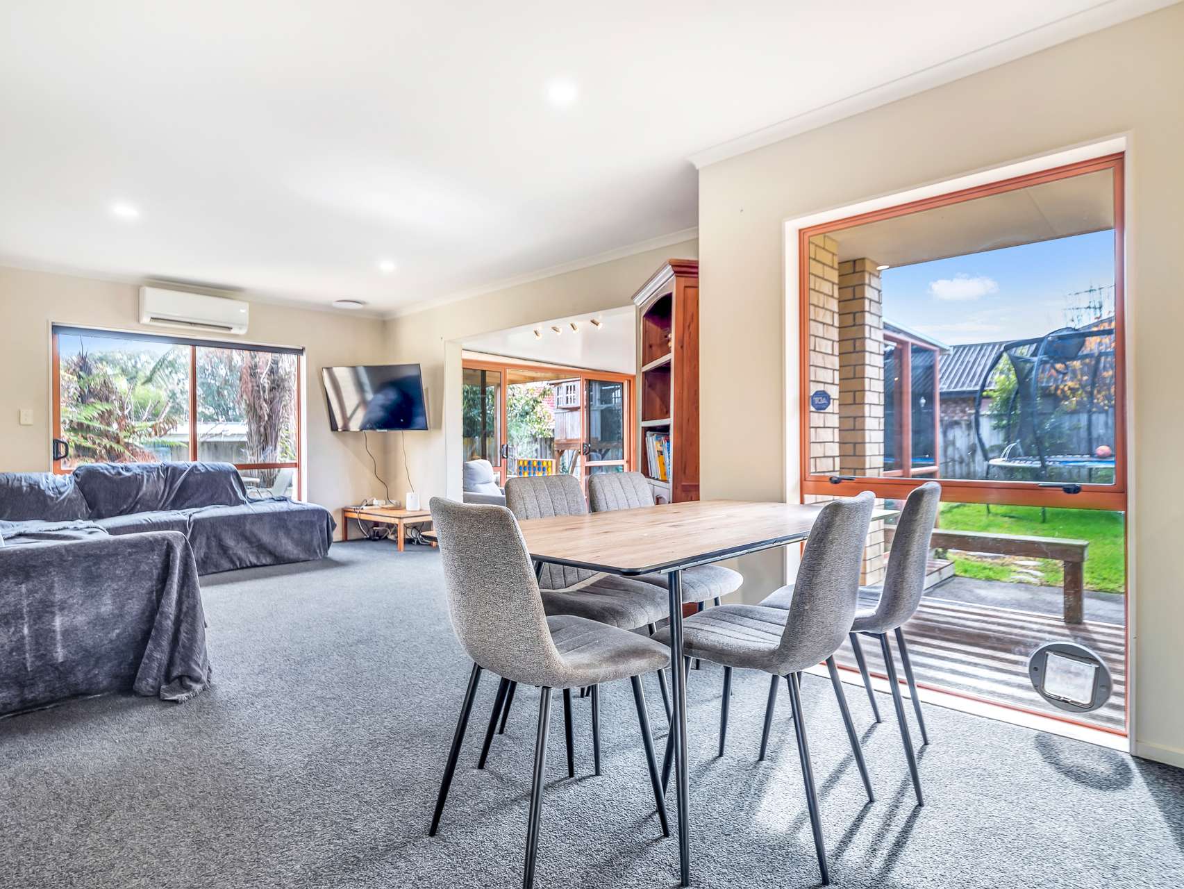 The open-plan family room and lounge is a lovely relaxed space, kept comfortable year-round with a heat pump and flooded with natural light. It has easy indoor-outdoor flow, including access out to a private covered deck that’s ideal for alfresco dining and summer BBQs.