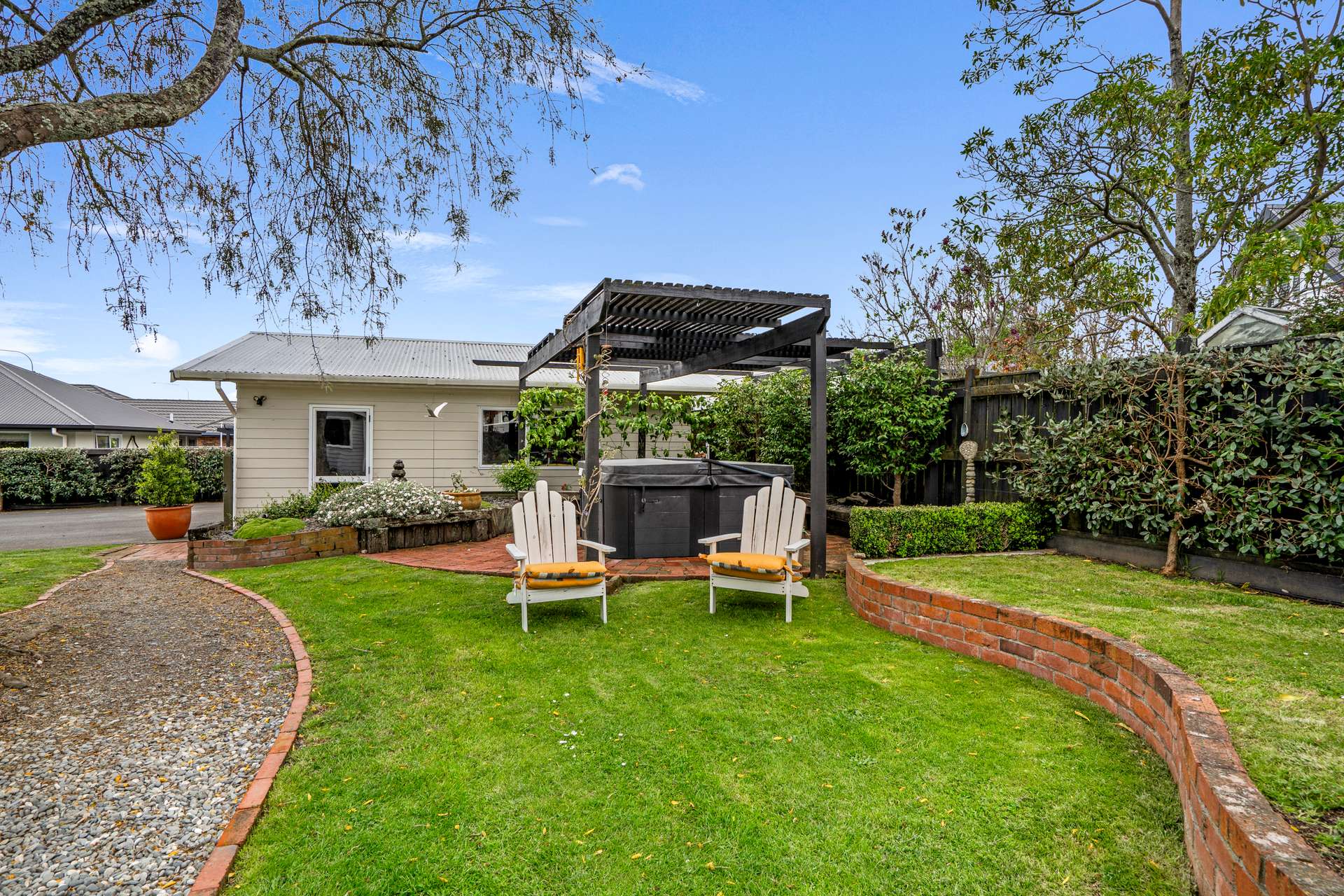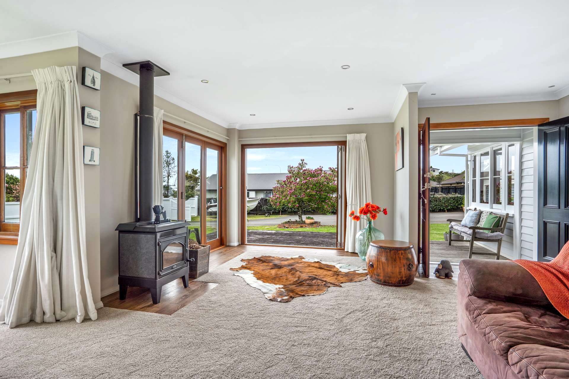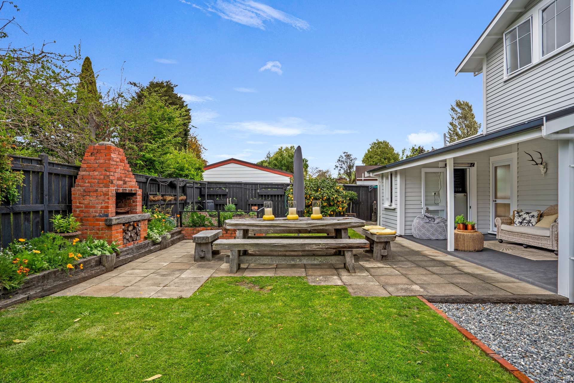 Outdoors, the presentation is exceptional. Elegant white fencing at the front enhances the street appeal, providing privacy and a polished finish to the property’s entrance. Beyond, sweeping lawns, fruit trees and an inviting outdoor fireplace create the perfect setting for family gatherings and entertaining. A standalone double garage and generous off-street parking easily accommodate boats, trailers or caravans.