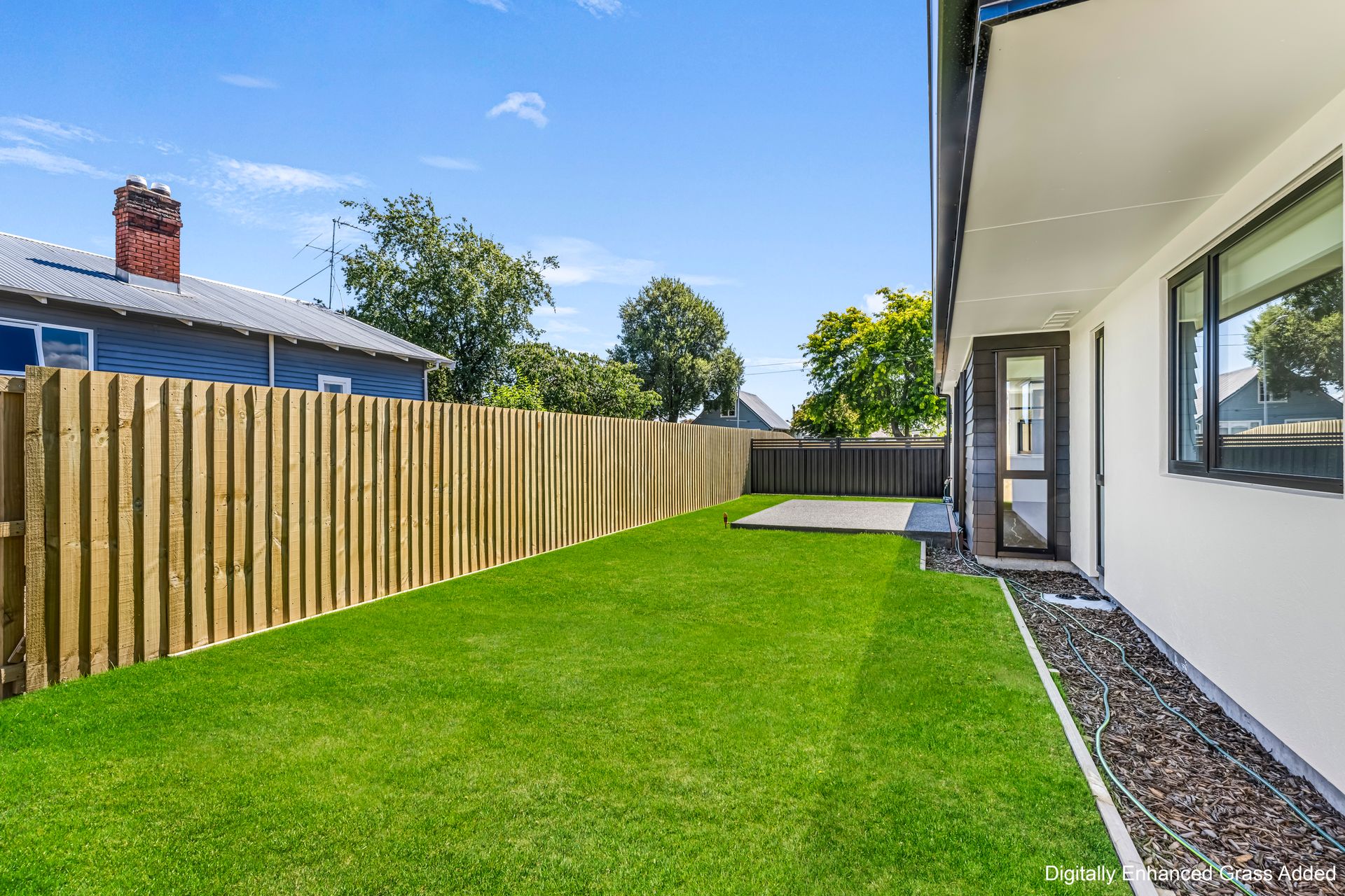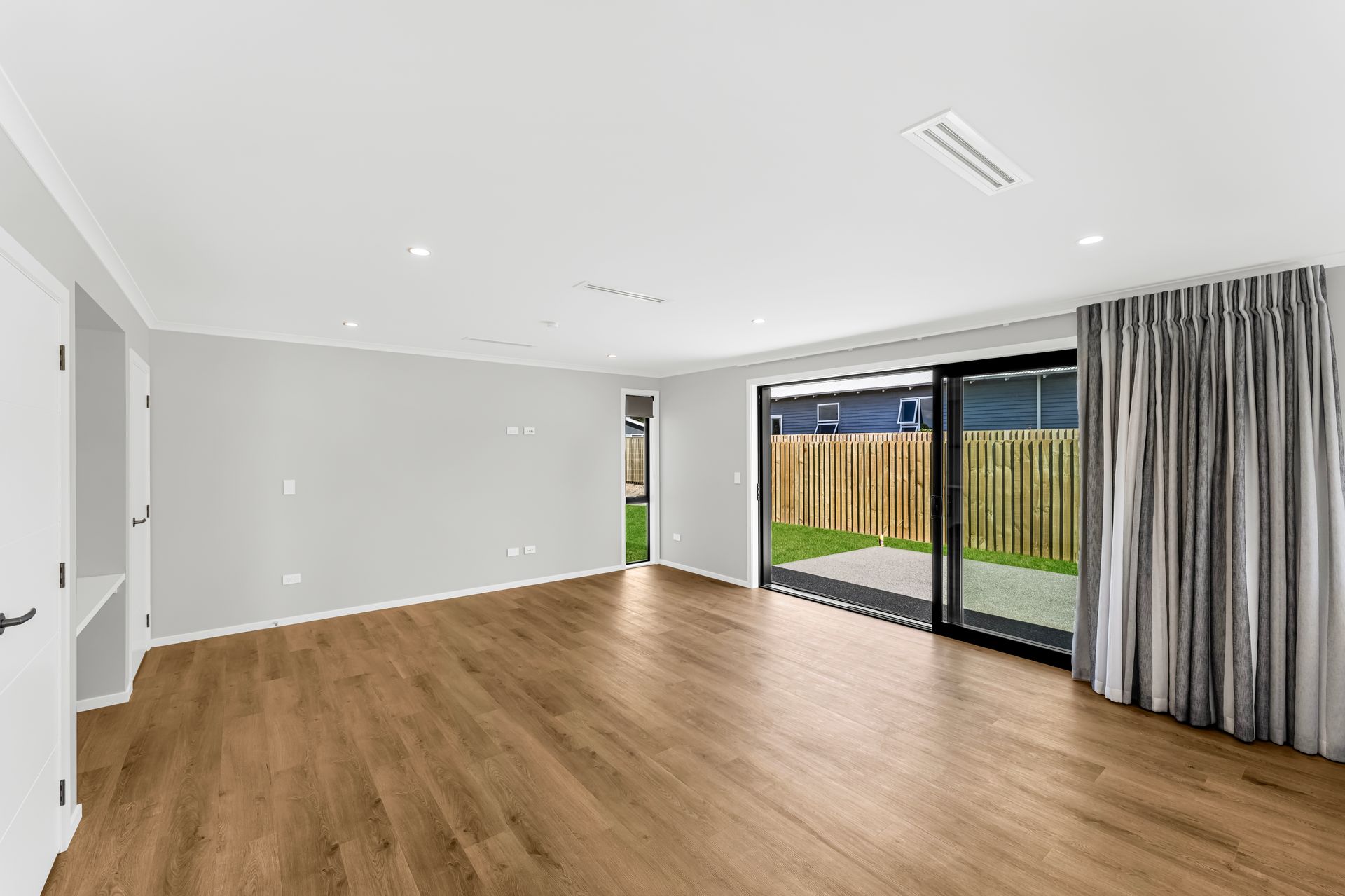 Large sliding doors extend the living space outdoors to a private, fully fenced yard with a paved patio and lawn. It’s a simple, well-sized outdoor area that’s easy to enjoy - ideal for relaxed entertaining, pets, or peaceful mornings outside without excess upkeep.