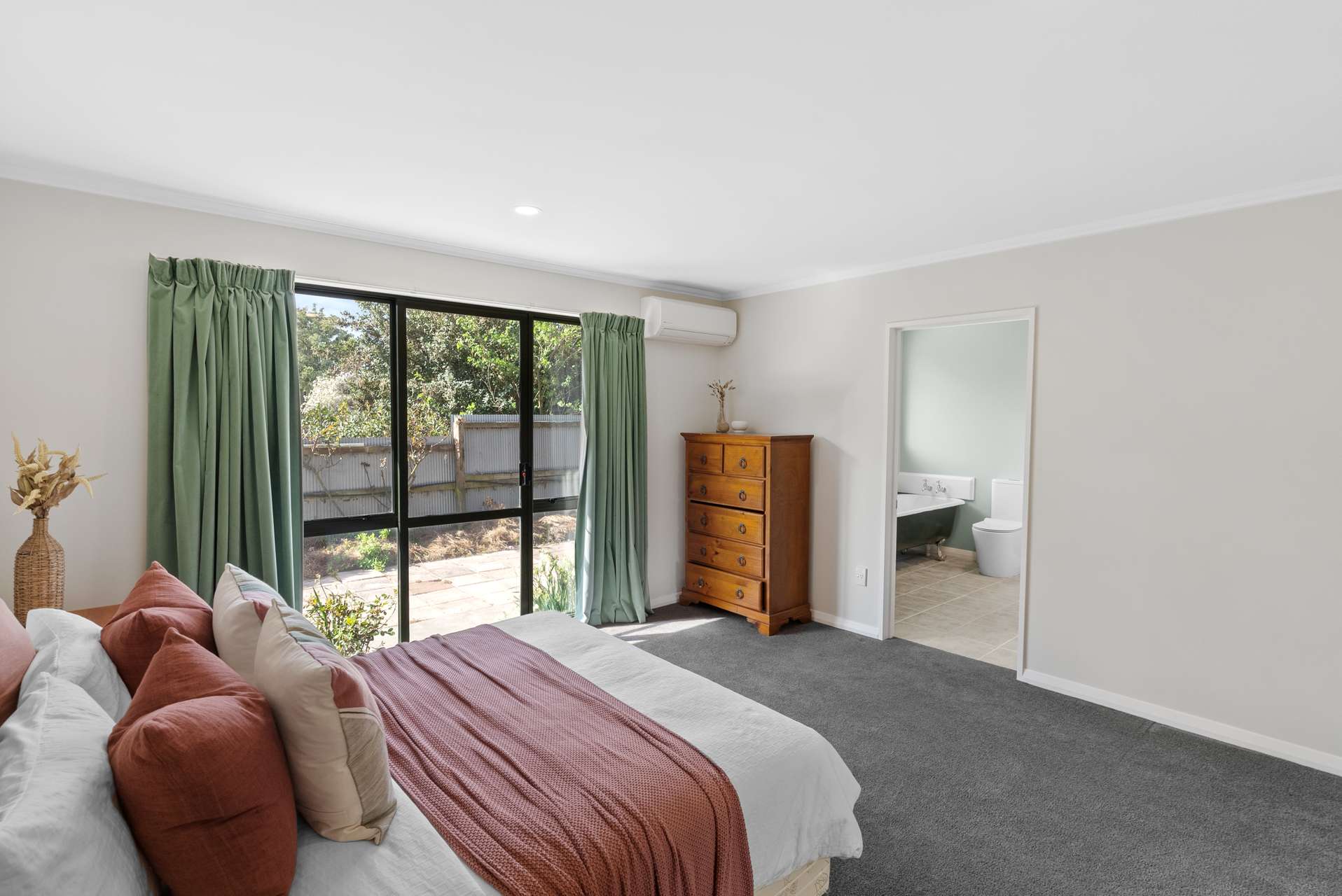 The large main bedroom is downstairs, beautifully renovated, with an ensuite, a heat pump, and super large wardrobes.