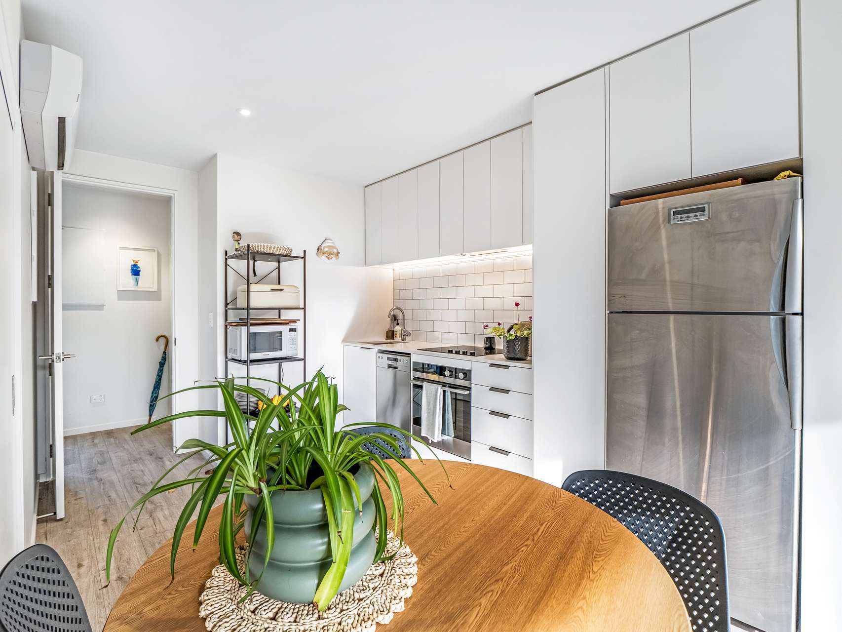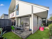Sitting quietly at the rear of the development, it opens into a light-filled living area that feels calm and inviting. The layout is compact but well-considered: open-plan lounge, dining, and kitchen flowing out to a west-facing deck and a surprisingly leafy backyard.