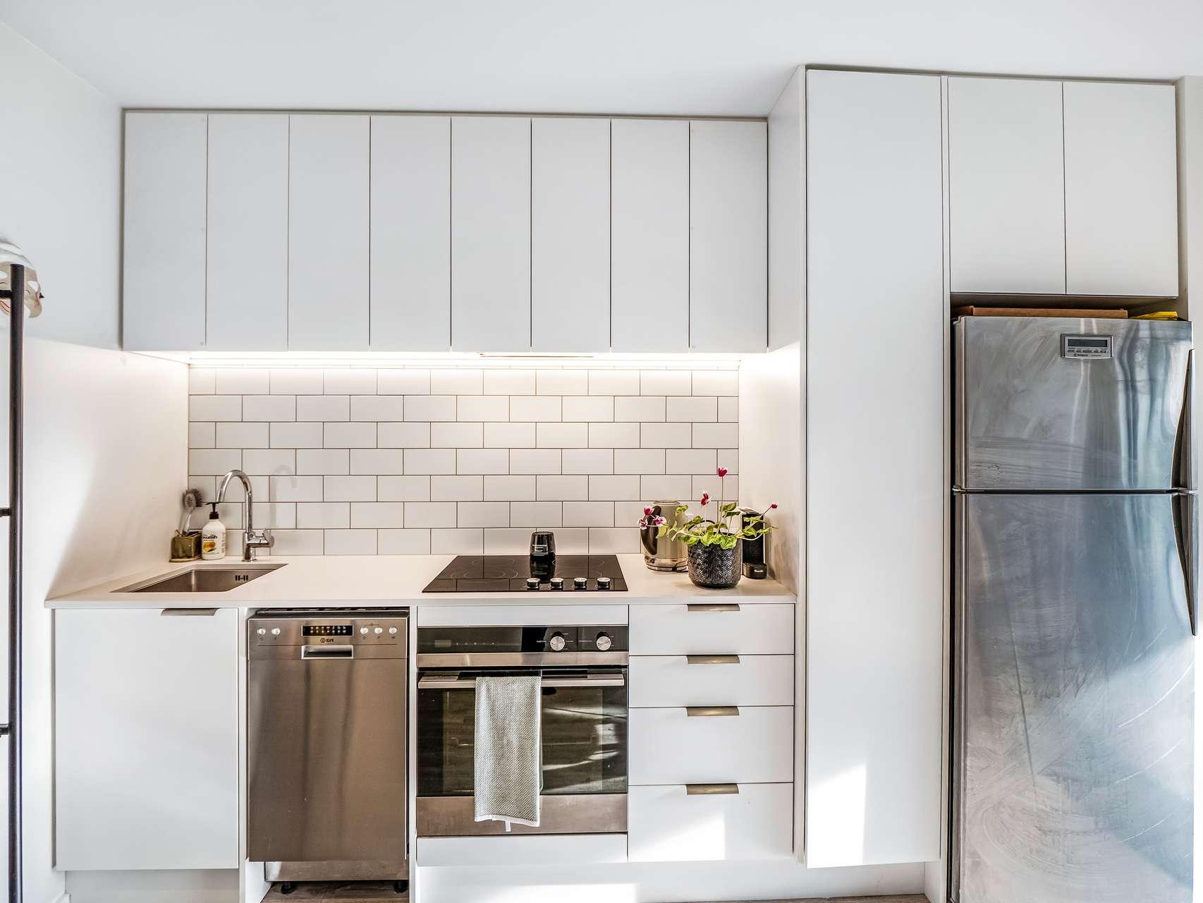 Inside, the kitchen is clean-lined and well-appointed with modern appliances, white cabinetry, and open shelving that keeps things flexible. The dining area fits a round table comfortably, and the heat pump keeps everything cosy in winter.