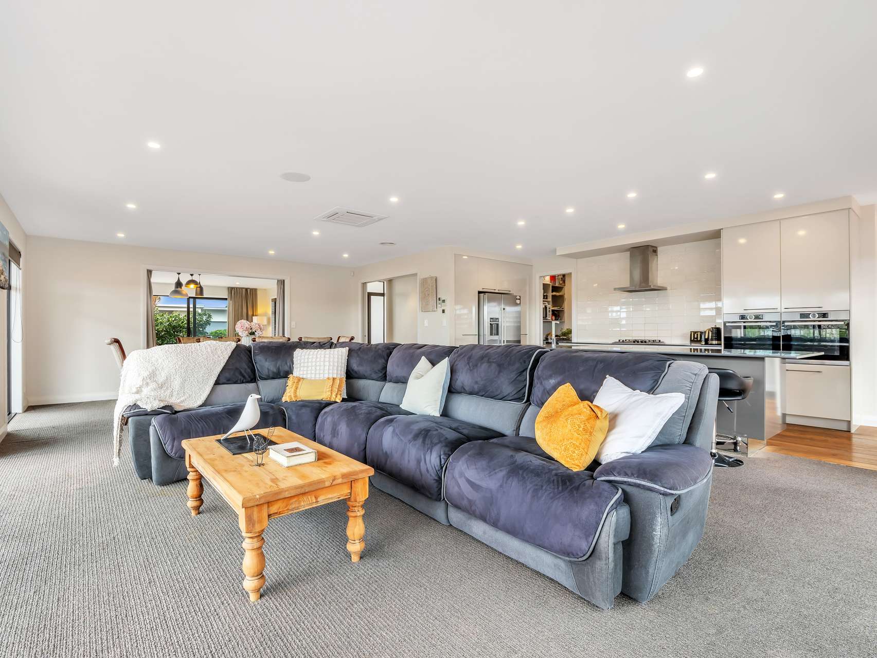 Four spacious bedrooms include a private master retreat with walk-in wardrobe and ensuite. A separate lounge with gas fireplace offers a cosy second living space, while a separate laundry, double garage, heat pump, central vacuum, and intelligent layout ensure comfort and practicality year-round.