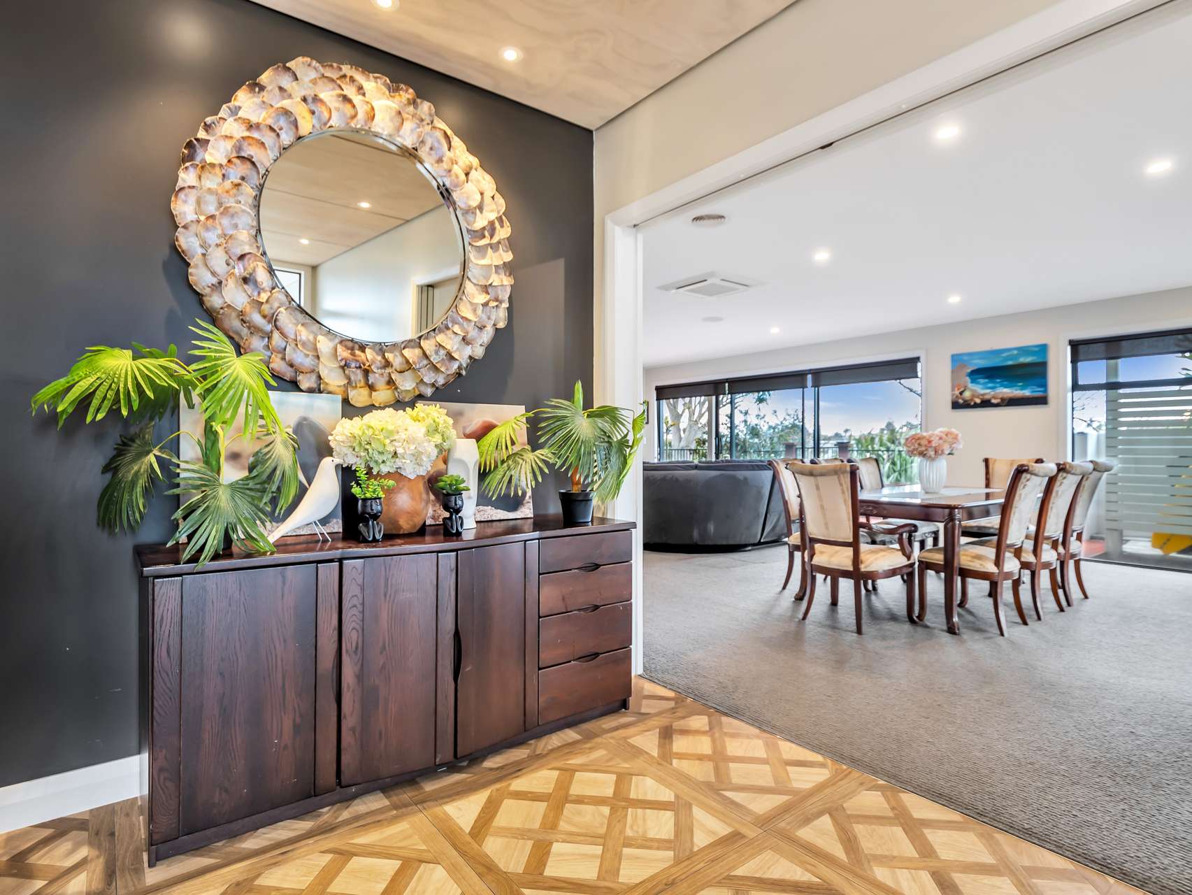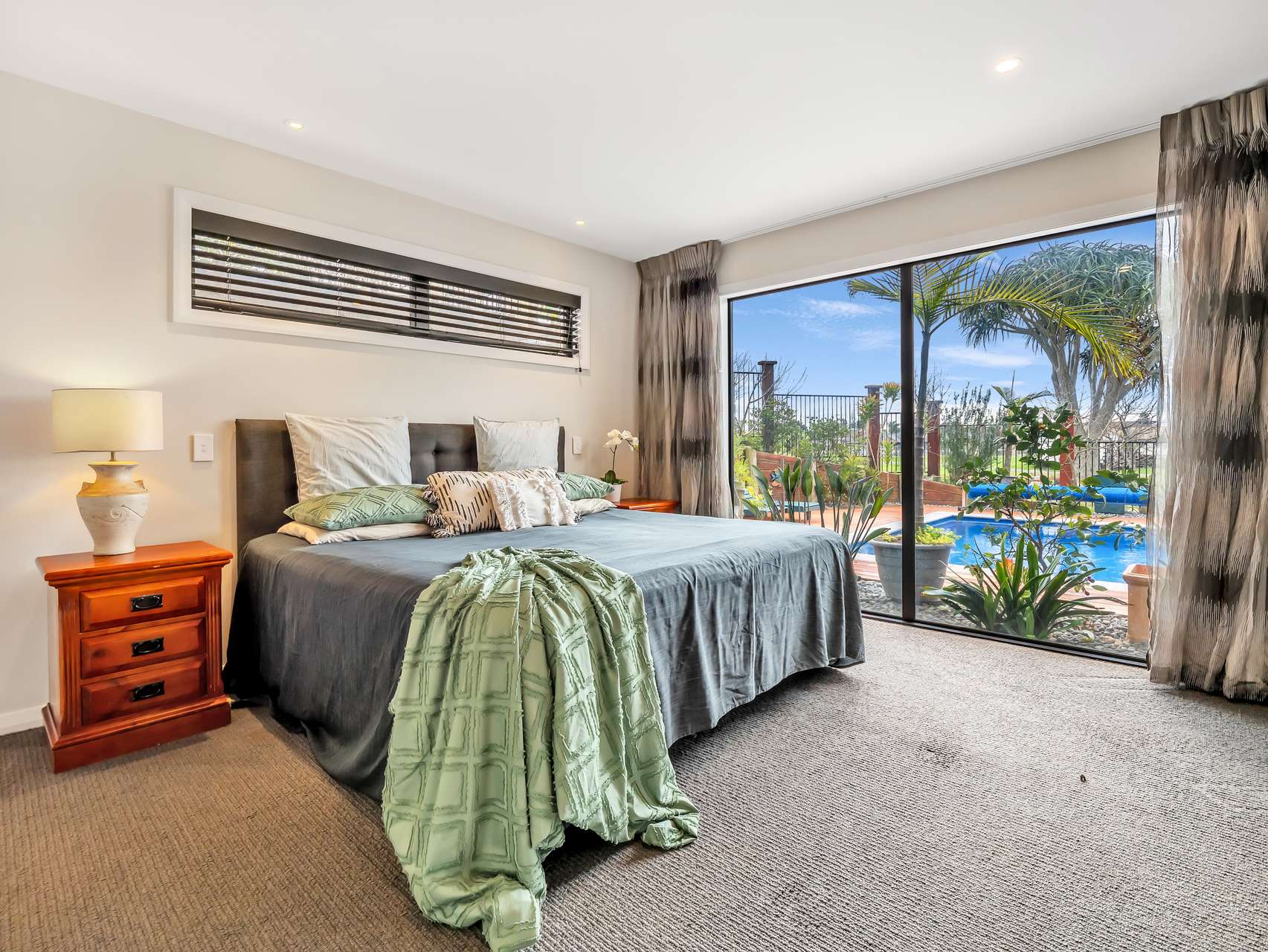A wide entrance foyer sets the tone for the home’s generous proportions, leading into a sun-drenched open-plan living zone. Stacking sliders and full-length windows flood the space with natural light and a seamless indoor-outdoor connection. At the heart of the home, the kitchen is designed for both everyday living and entertaining — flowing effortlessly to the Louvretec-covered deck and poolside patio, perfect for long summer evenings.