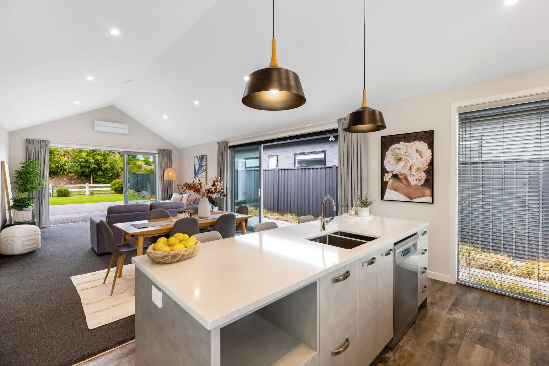 The open plan kitchen, living and dining area is the heart of the home, with beautiful high raked ceilings that create a bright, airy feel. A heat pump keeps things comfortable, while the living and master bedroom both open out to a sunny patio - ideal for entertaining or unwinding in the evening sun.