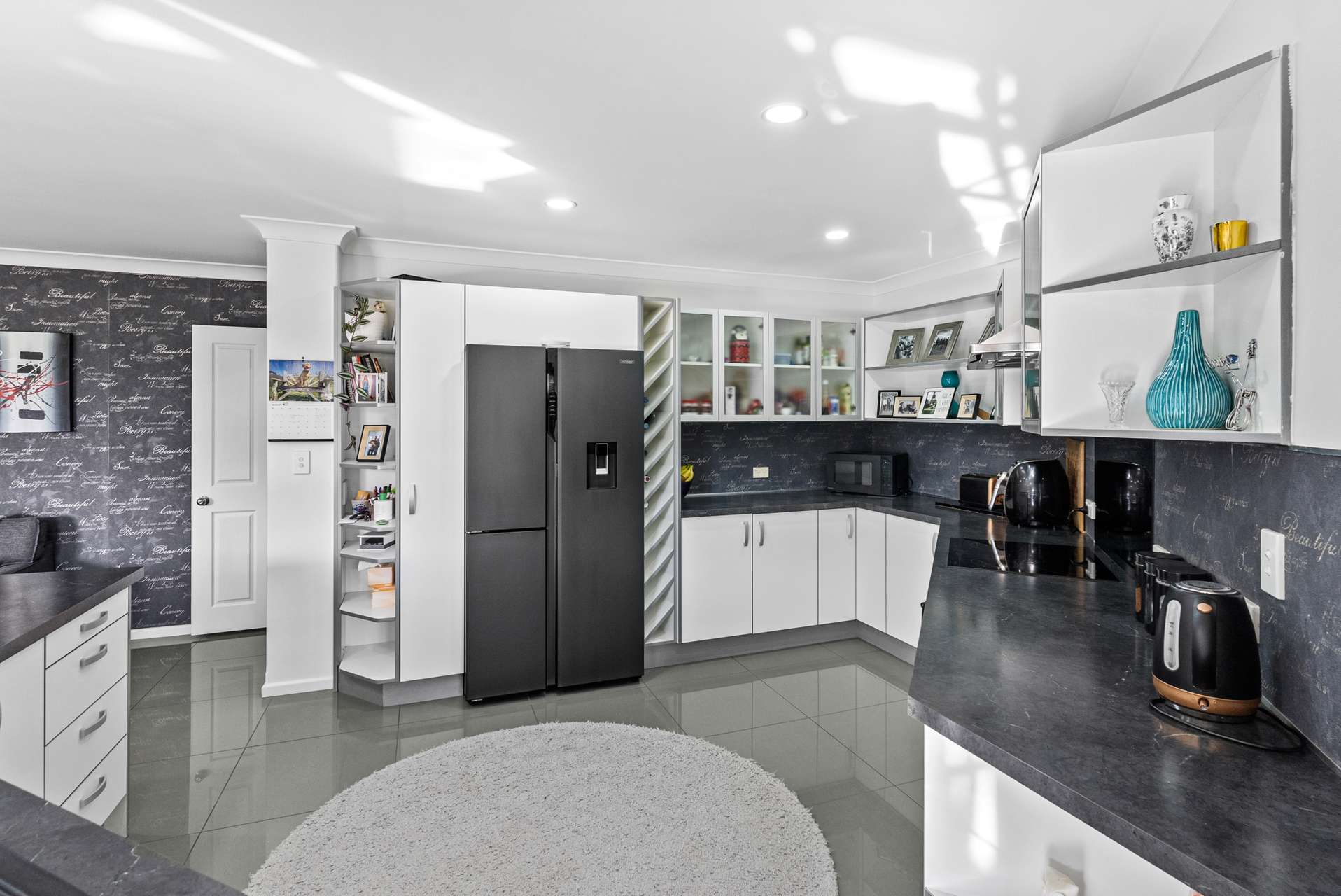 The kitchen is nice and spacious with plenty of room for more than one chef. It has a large breakfast bar for entertaining or a quick bite after school and a beautiful monochromatic color scheme.