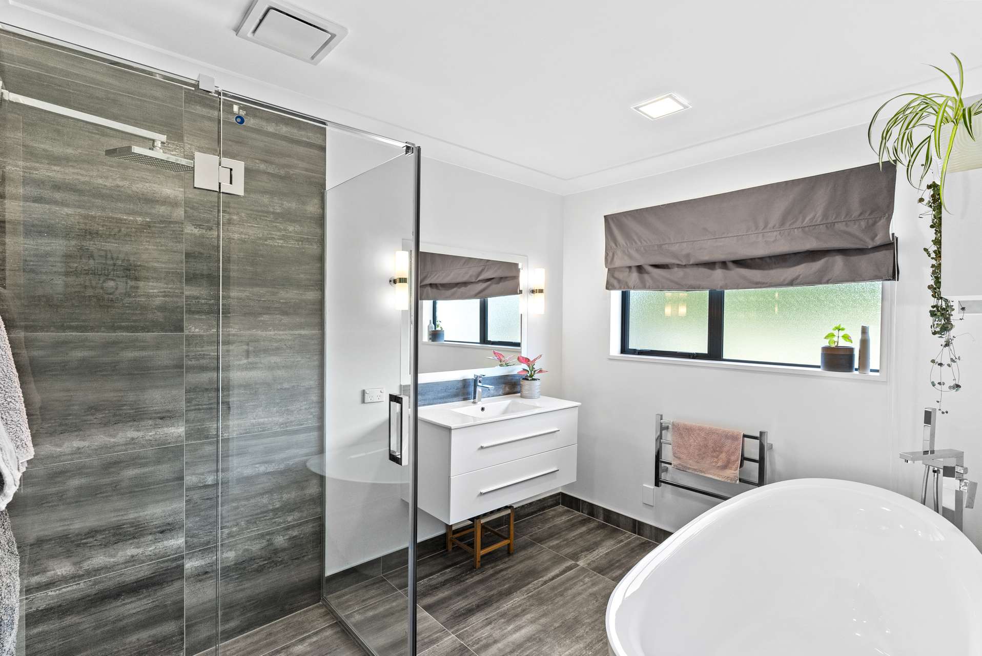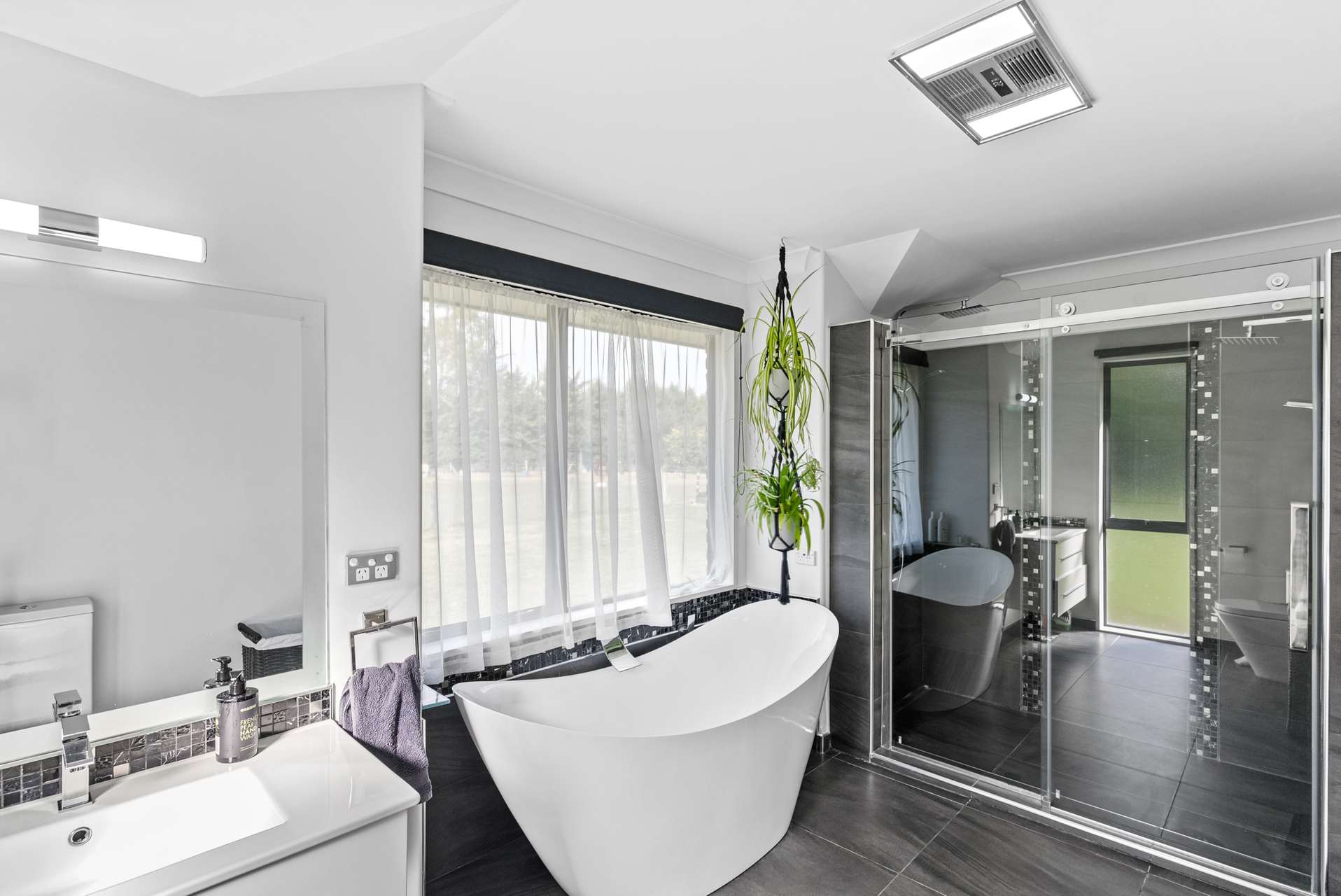 The master has a real sense of drama with a feature wall, easy access outside, and a wonderful ensuite with the most incredible free-standing bathtub.