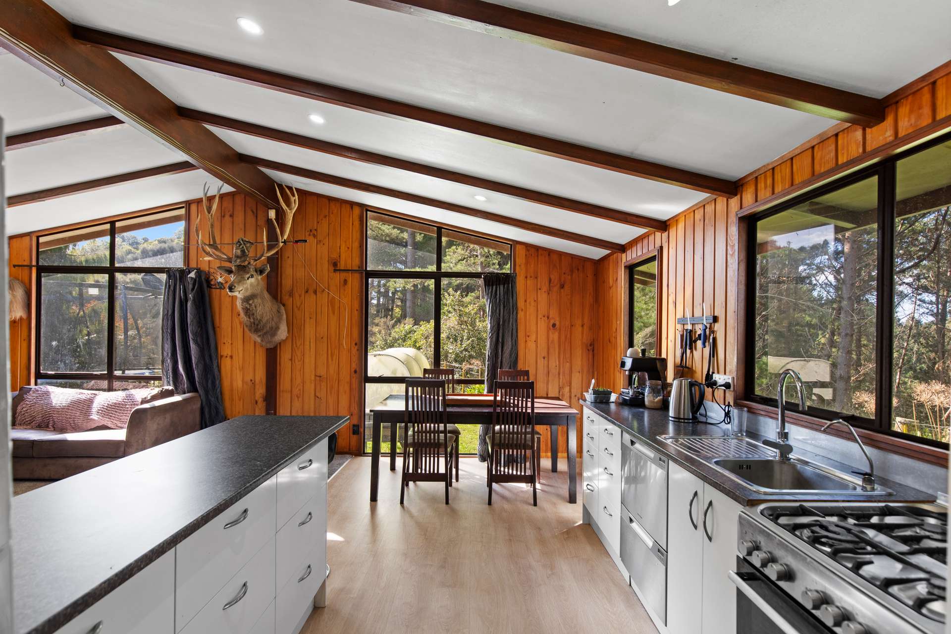 The open-plan living space is designed to make the most of its serene surroundings, featuring high raked ceilings and a beautiful use of timber that exudes warmth and character. Large windows frame the scenic views, truly bringing the outside in, while the fireplace adds a cosy touch there is also an air conditioning unit as an added benefit as well as brand new carpet and flooring.