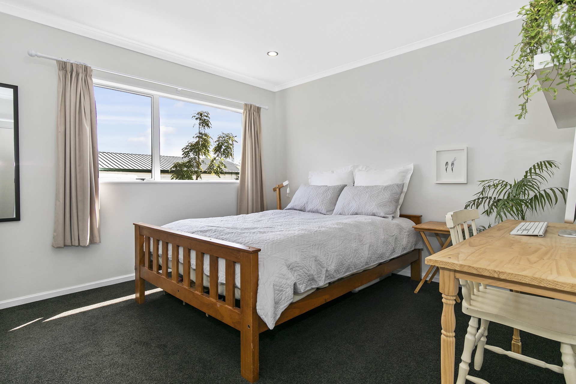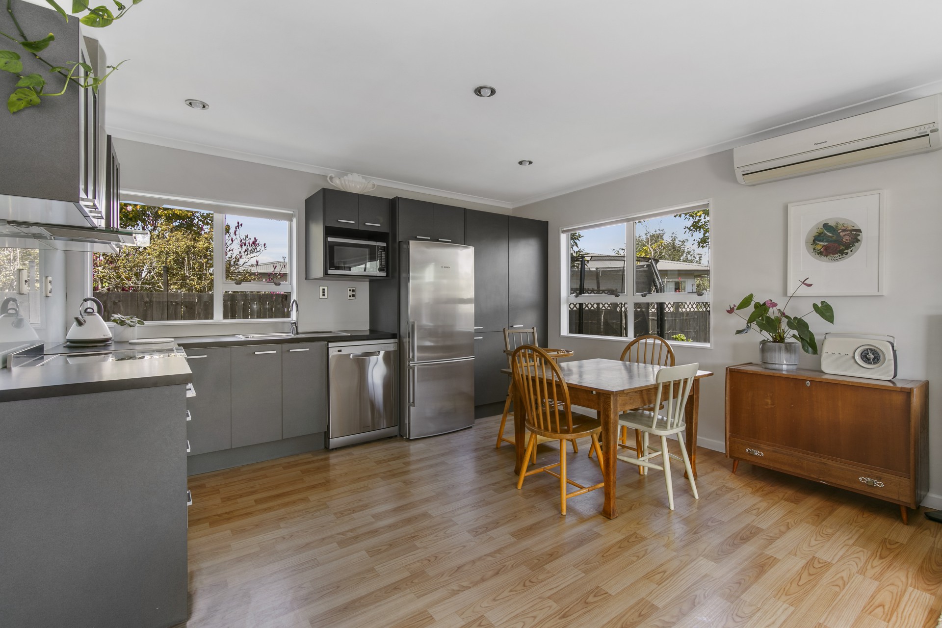 The open-plan kitchen, dining and lounge area is a long spacious room that flows out to the back deck via a sliding door. This deck faces west and catches all those glorious afternoon rays; so you’ll definitely want to be barbequing out here on summer evenings. Put an outdoor dining table or seating area here to maximise on the space. Back inside kitchen is accented with dark cabinetry and features a heat pump for efficiently and economically keeping the house warm.