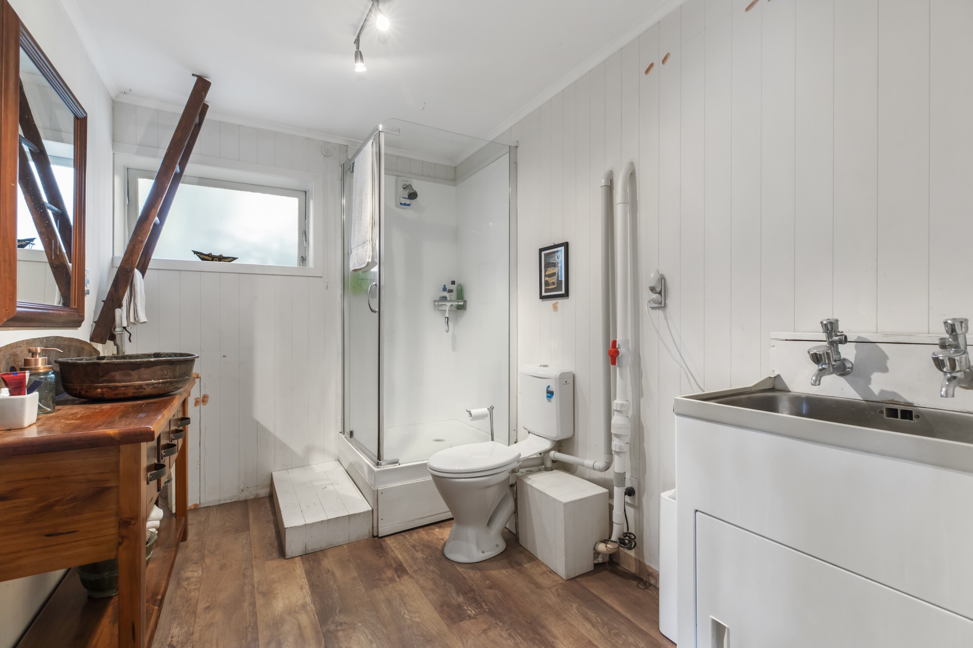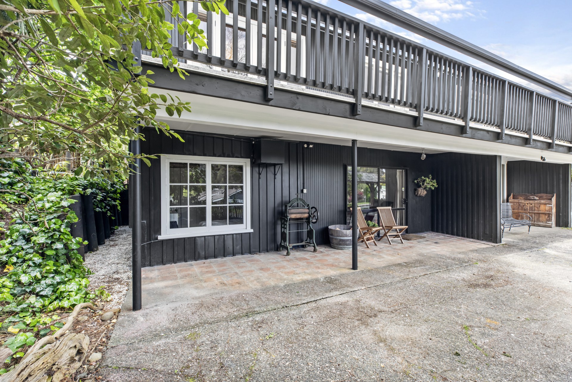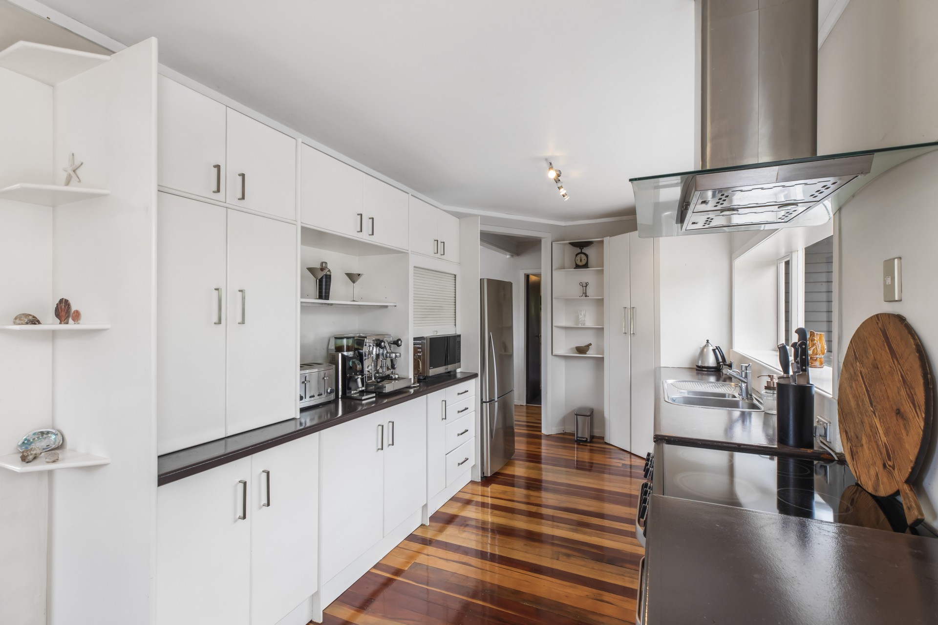 Upstairs the light and bright kitchen, dining and living area opens up onto a big elevated deck which gives you gorgeous green views of this amazing property. The white on white colour scheme looks fabulous with the stunning hard wood floors, big windows let you make the most of the view and the fireplace will keep you warm and toasty in the cooler weather.
