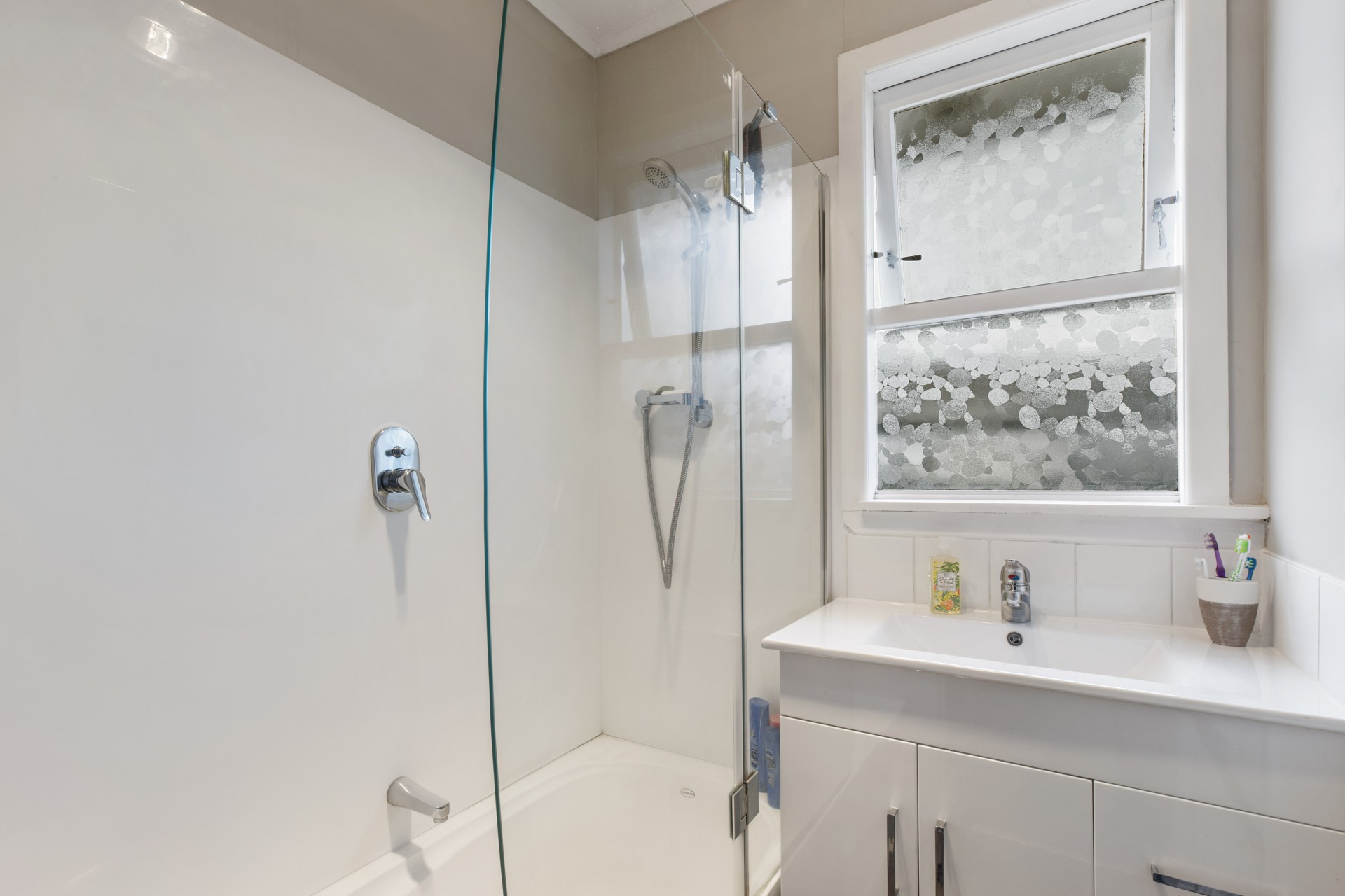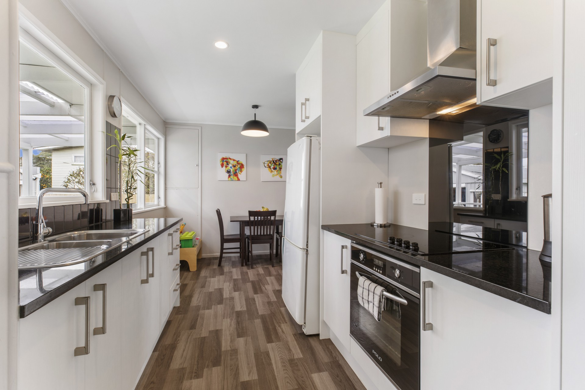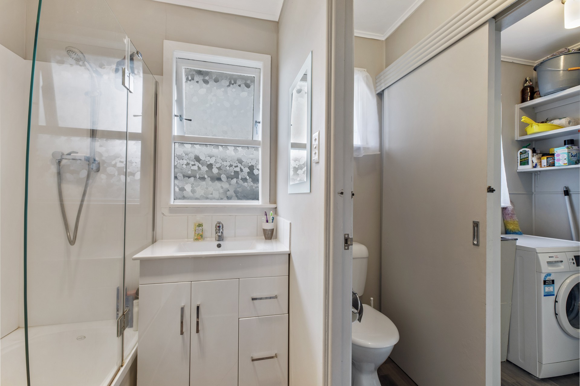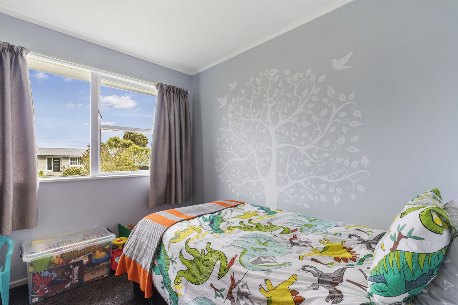 The bedrooms are cosy and clean, and one room has a lovely tree painted on one wall for a subtle touch of creativity. The lounge has a heat pump to regulate the temperature of the house, and the kitchen has white and black stone surfaces, with large windows facing the garden. The bathroom has a shower/bath in one, and the toilet is conveniently separated. Beside it lies the laundry room, with lots of shelving for storing powders and soaps.