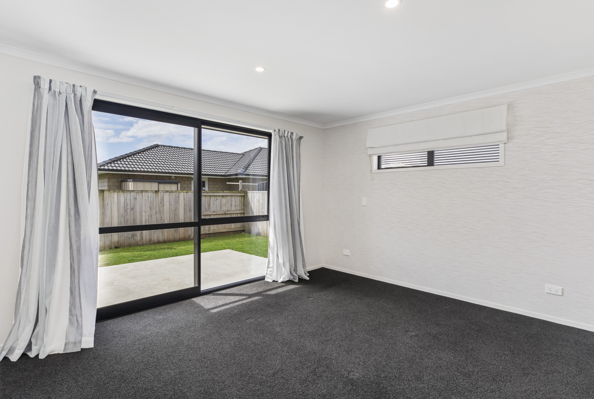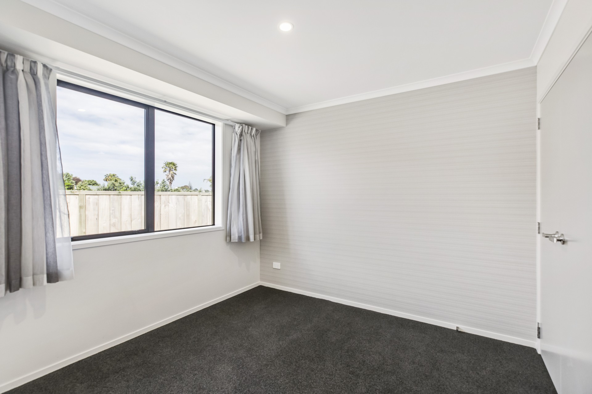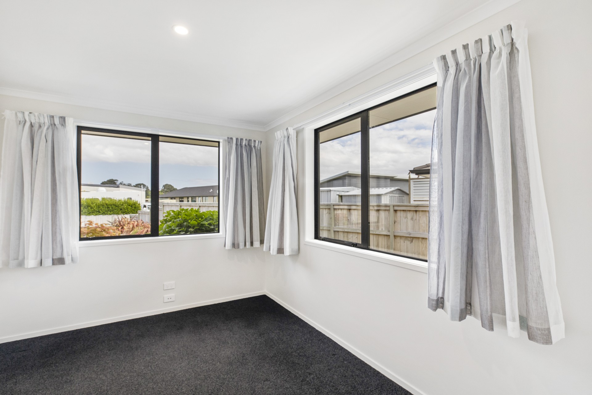 The open-plan living area is chic and beautiful. The tiled kitchen has everything you need for fabulous modern living and cooking; stainless-steel appliances, tiled splashback, filter water and an island counter with seating options. The dining area opens out to the paved patio on the side of the house, giving the area indoor/outdoor flow. The lounge is carpeted, giving these spaces visual distinction, and has a heat pump to ensure you’re at the perfect temperature all year round. Large windows and white walls make this whole room bright and fresh.