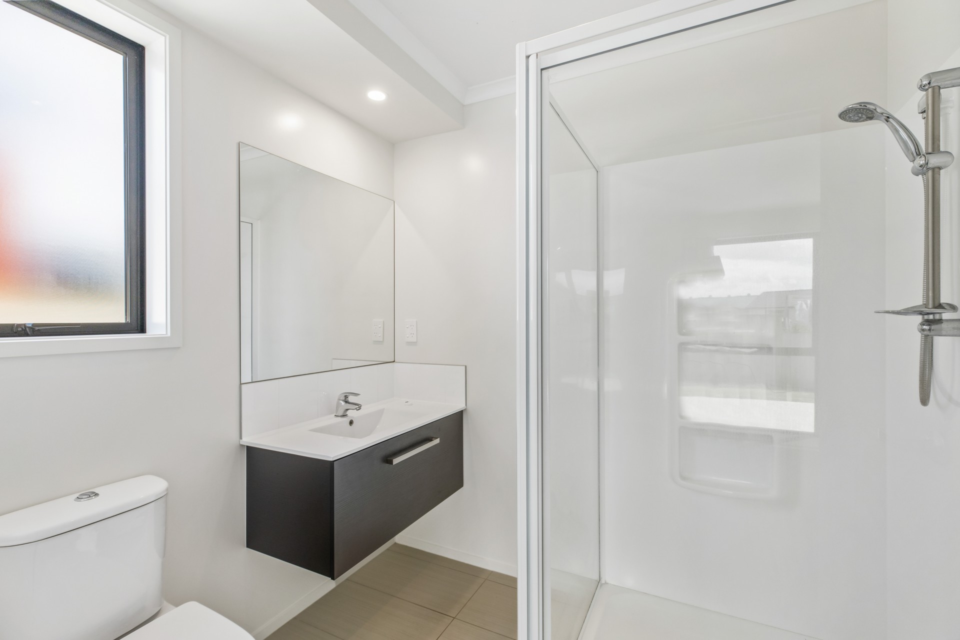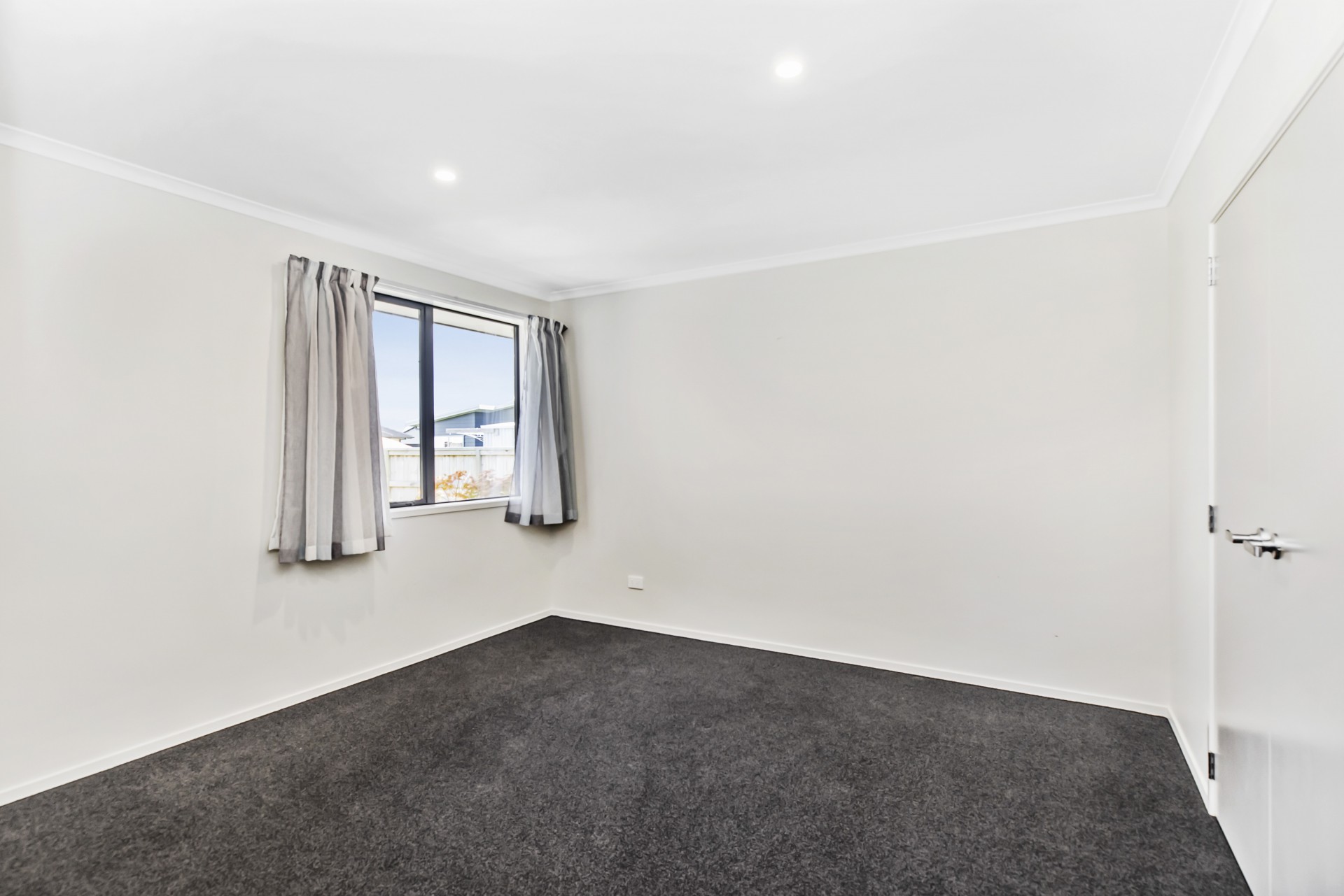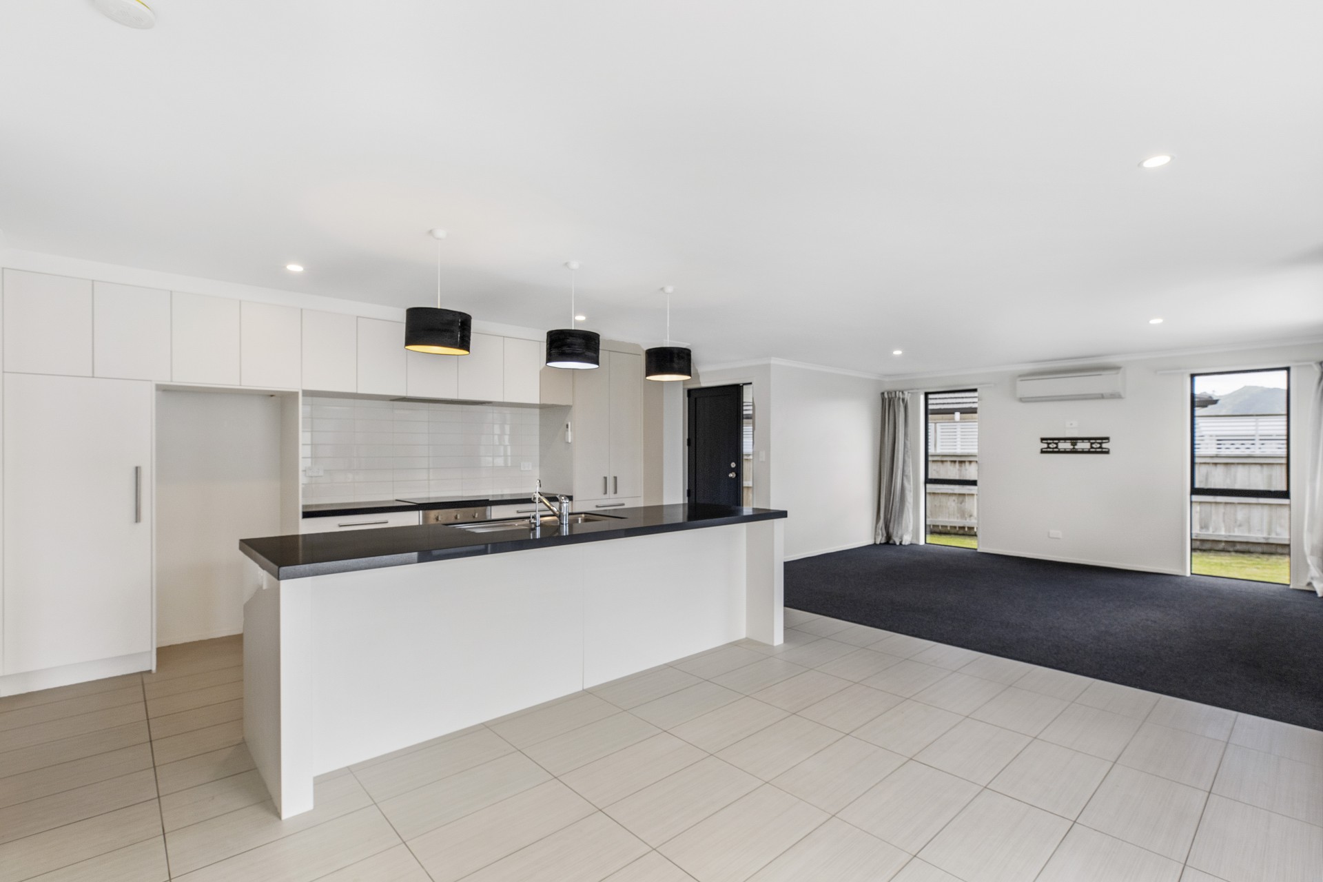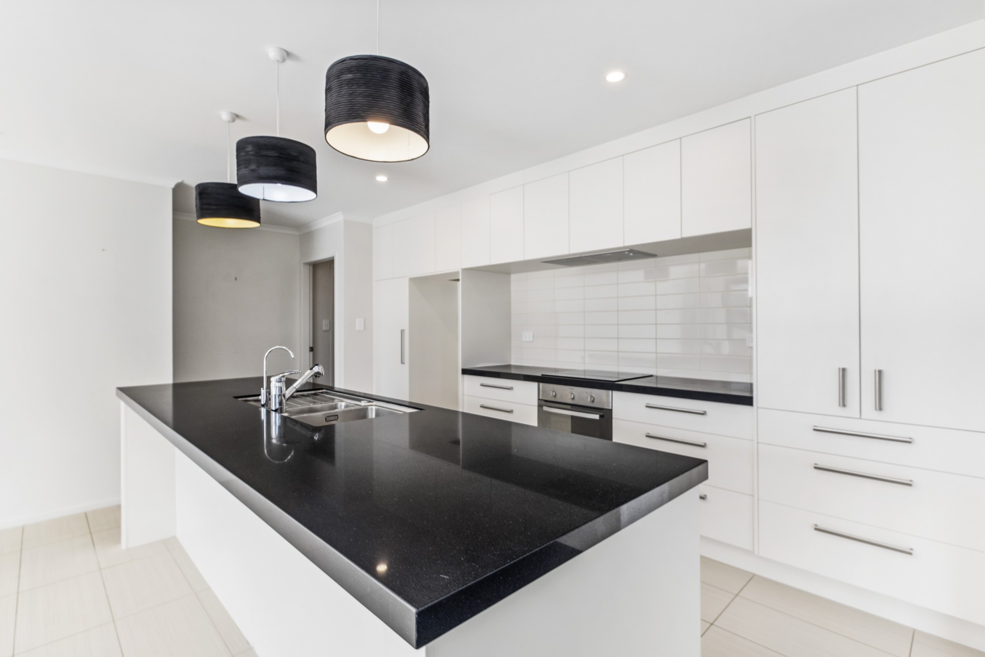 The open-plan living area is chic and beautiful. The tiled kitchen has everything you need for fabulous modern living and cooking; stainless-steel appliances, tiled splashback, filter water and an island counter with seating options. The dining area opens out to the paved patio on the side of the house, giving the area indoor/outdoor flow. The lounge is carpeted, giving these spaces visual distinction, and has a heat pump to ensure you’re at the perfect temperature all year round. Large windows and white walls make this whole room bright and fresh.