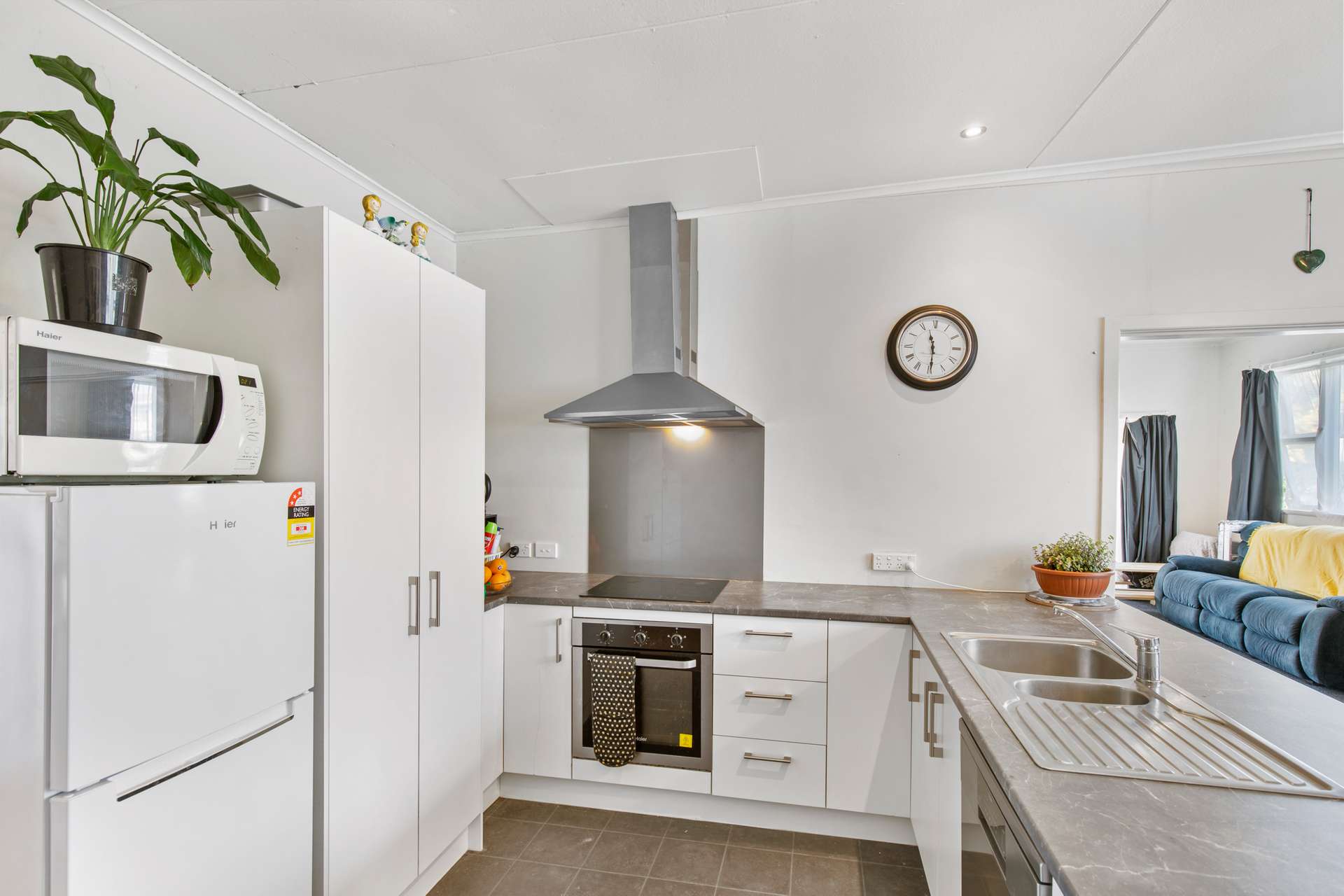 The updated kitchen has stylish white cabinetry, a marbled look benchtop and sleek modern appliances. It’s a good size, with space for all the essentials.