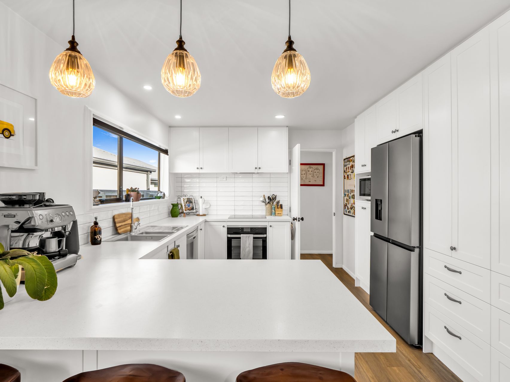The heart of the home is its shared living areas. A generous kitchen with a large island, breakfast seating, and ample bench space connects seamlessly to the dining area. The main living room and separate family room provide options for busy mornings, quiet evenings, or hosting friends without everyone ending up in one place. Flow to the deck makes entertaining effortless, while a wood burner, two heat pumps, and a home ventilation system ensure year-round warmth and comfort.
