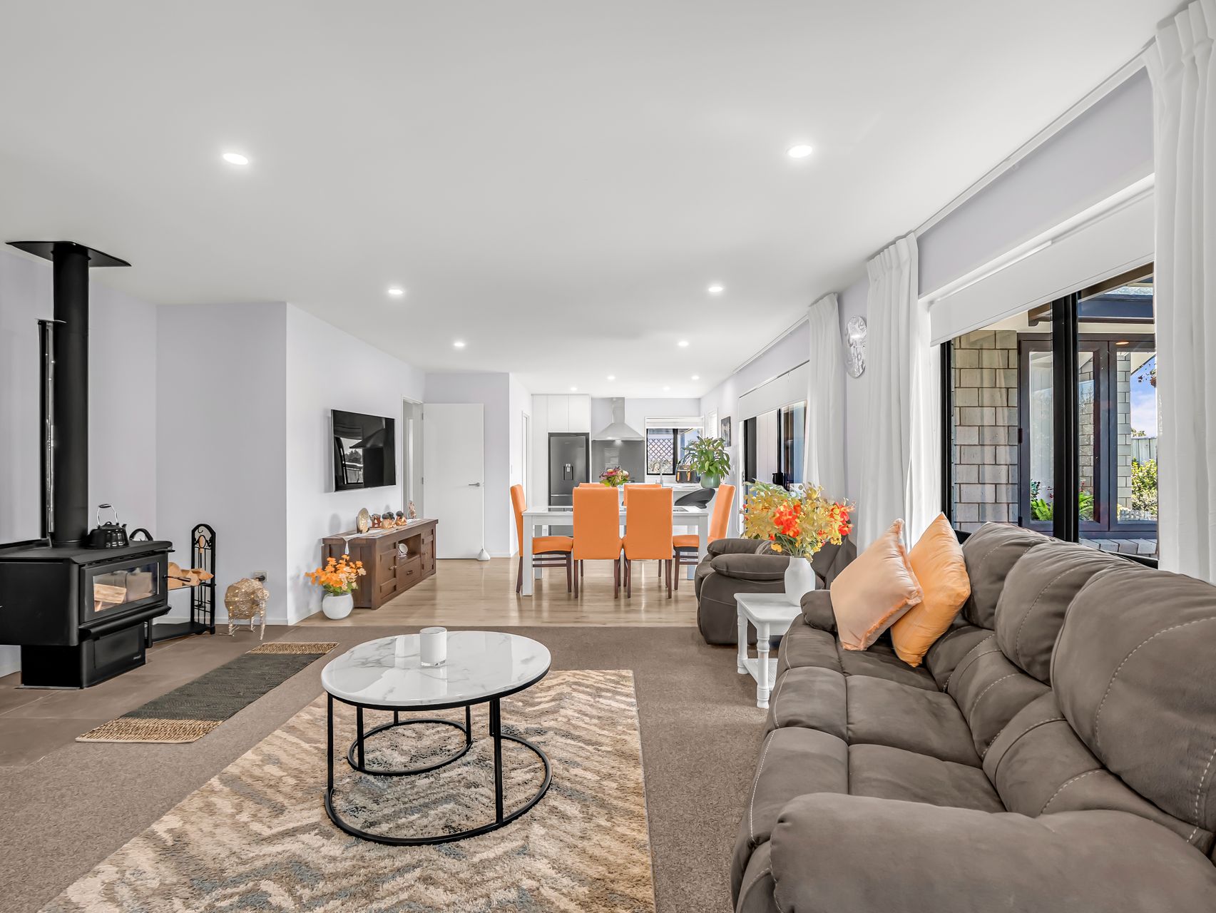 The kitchen is built for proper use. A generous island, modern appliances and plenty of bench space make everything from school lunches to weekend hosting easy. A wood burner anchors the living area, adding warmth and atmosphere, while neutral finishes give you a home that’s ready to adapt to your style.