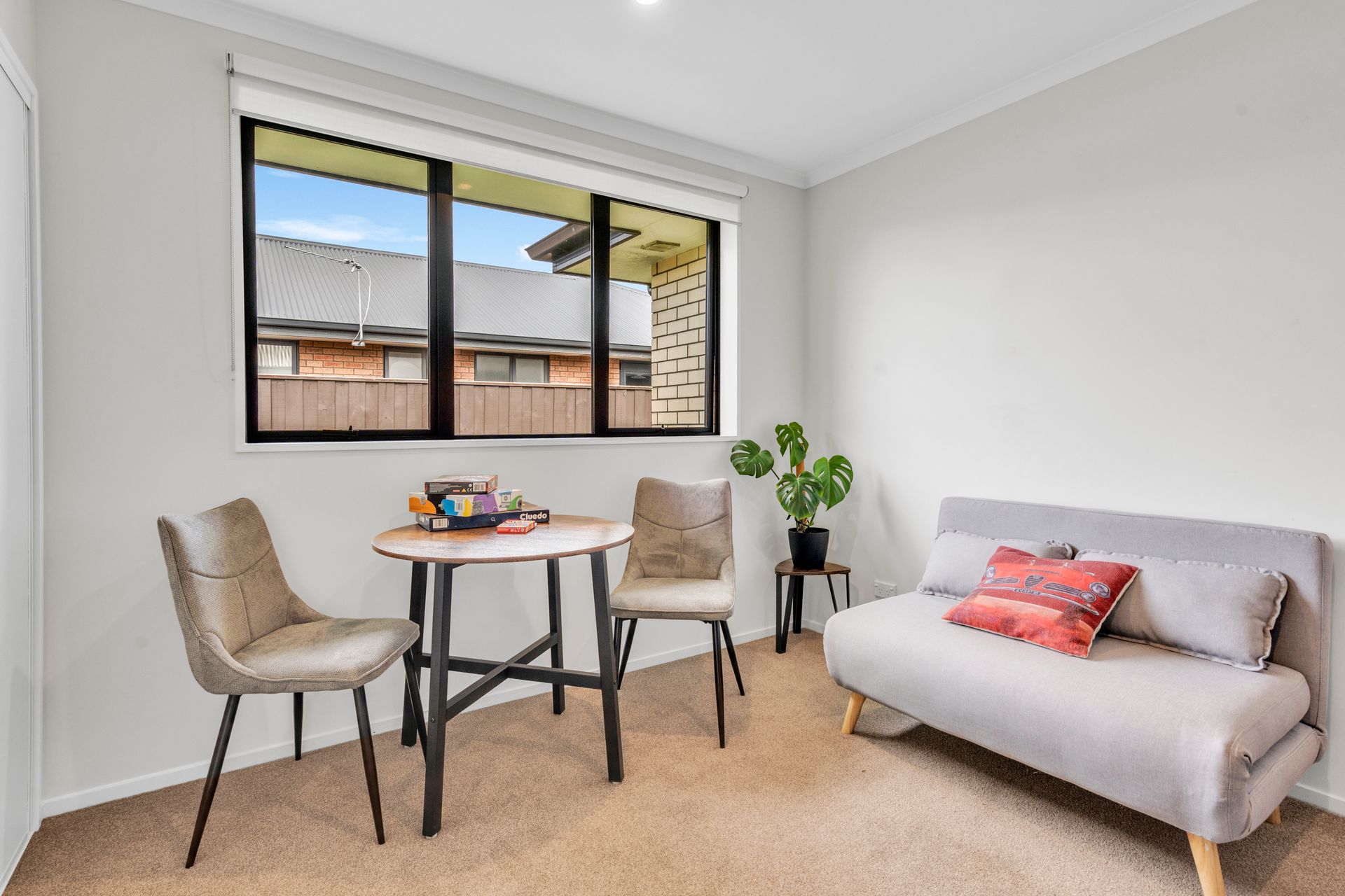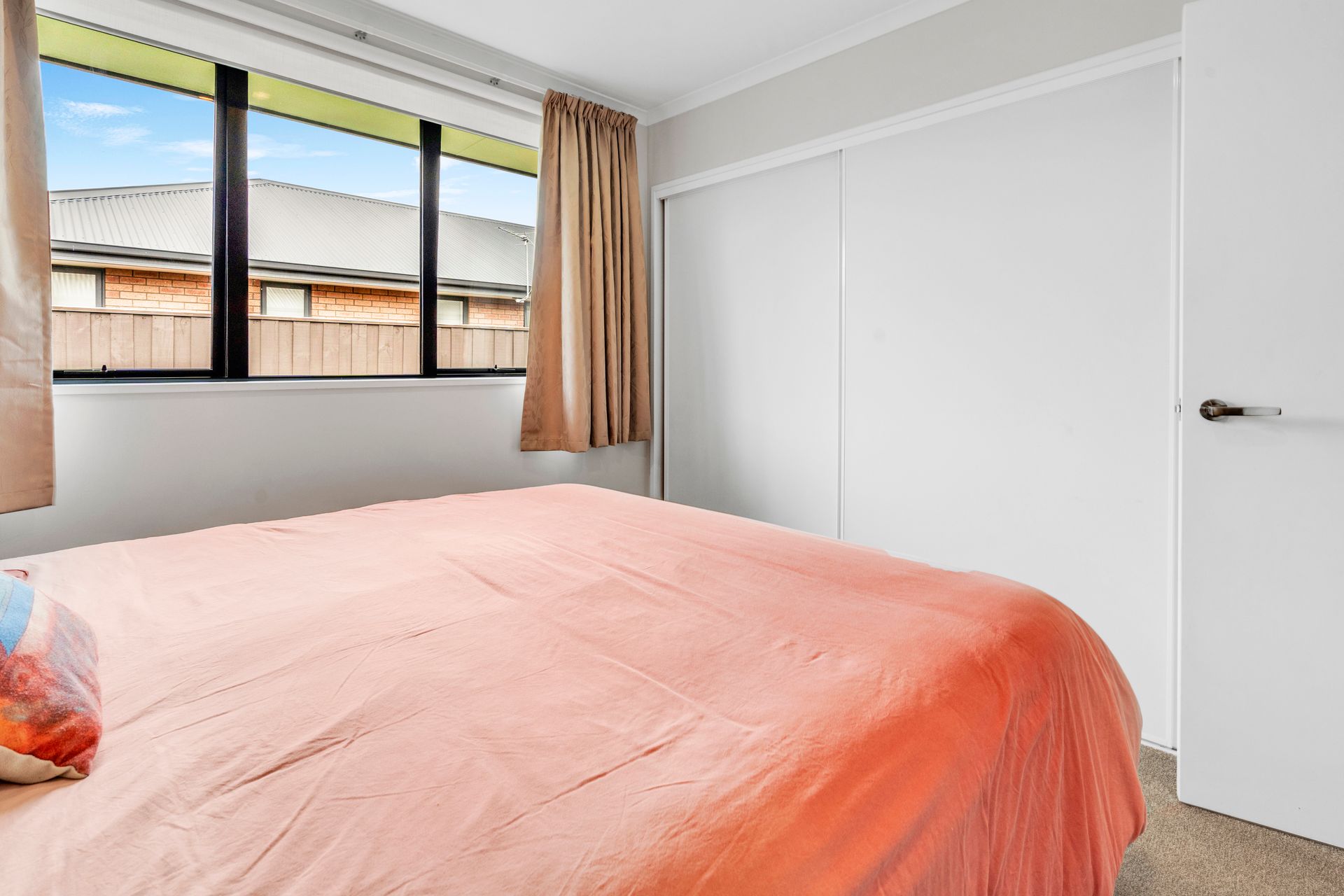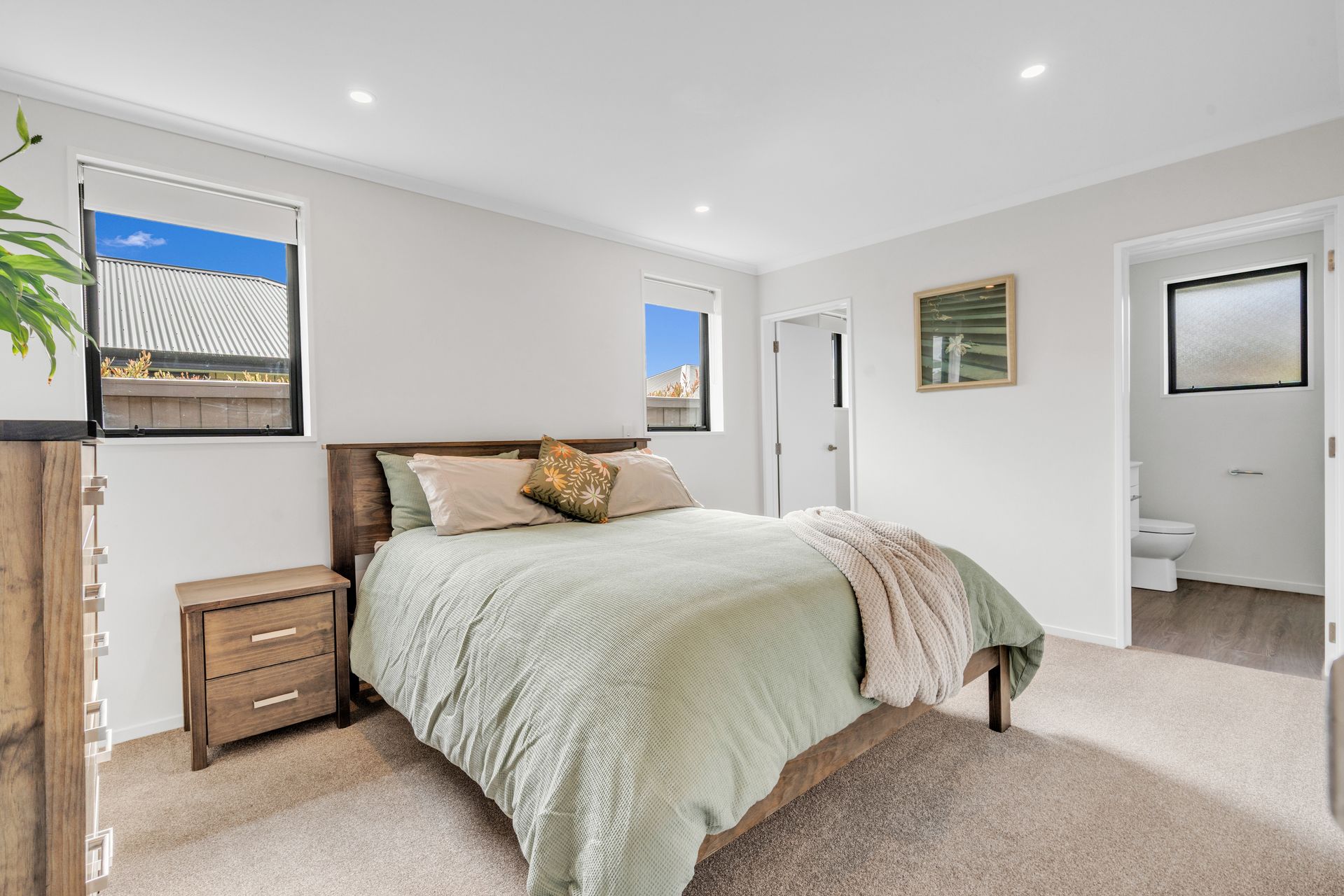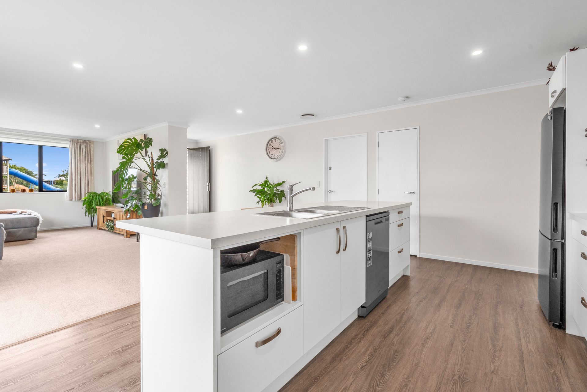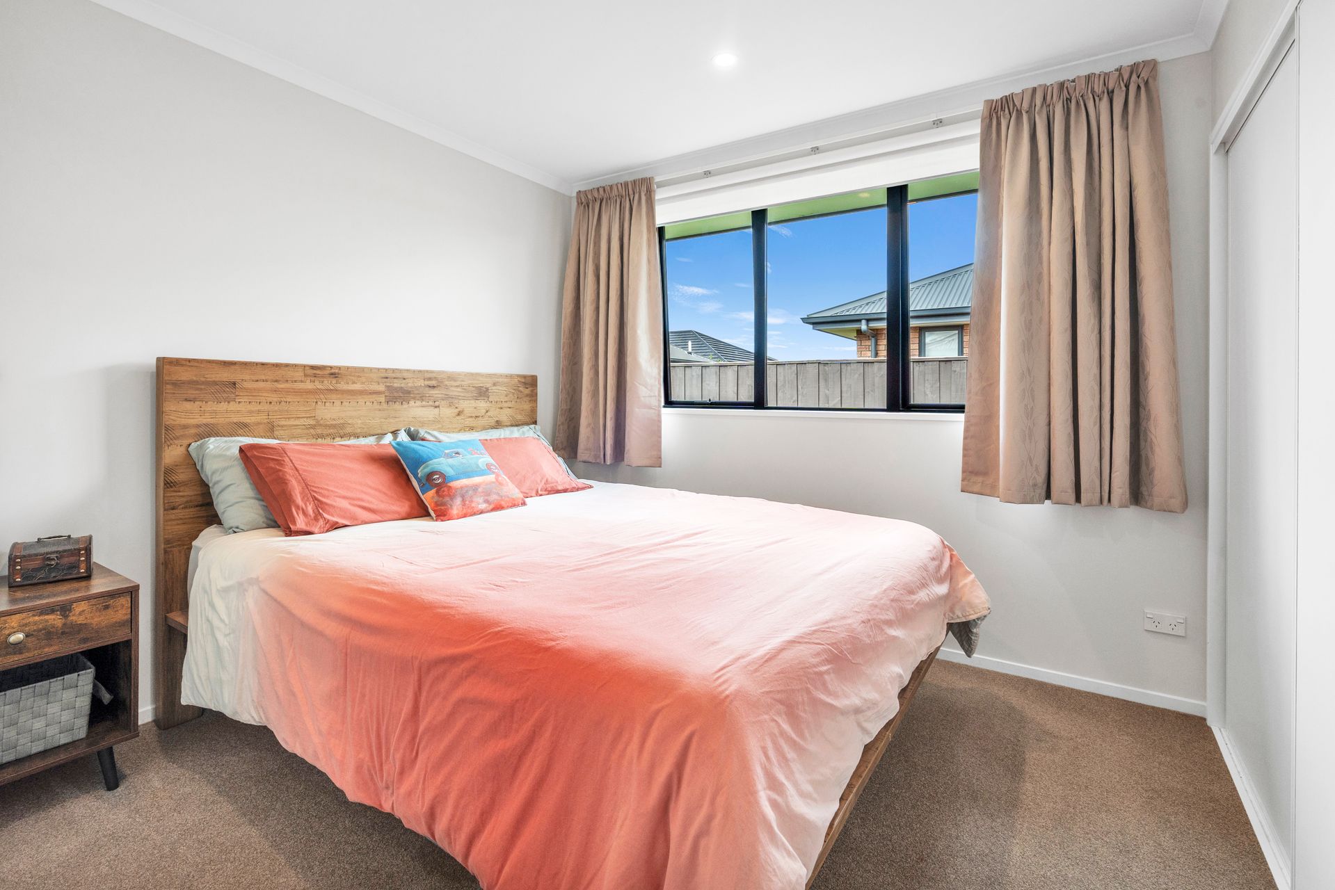 The home boasts a generous open-plan living zone. Wood-look flooring defines the kitchen area, while soft carpet underfoot in the lounge creates a cosy contrast. Recessed lighting and large windows keep the interior bright and a heat pump ensures year-round comfort. Sliding doors extend the living space outdoors, creating an easy indoor-outdoor flow that works just as well for relaxed evenings as it does for entertaining friends.