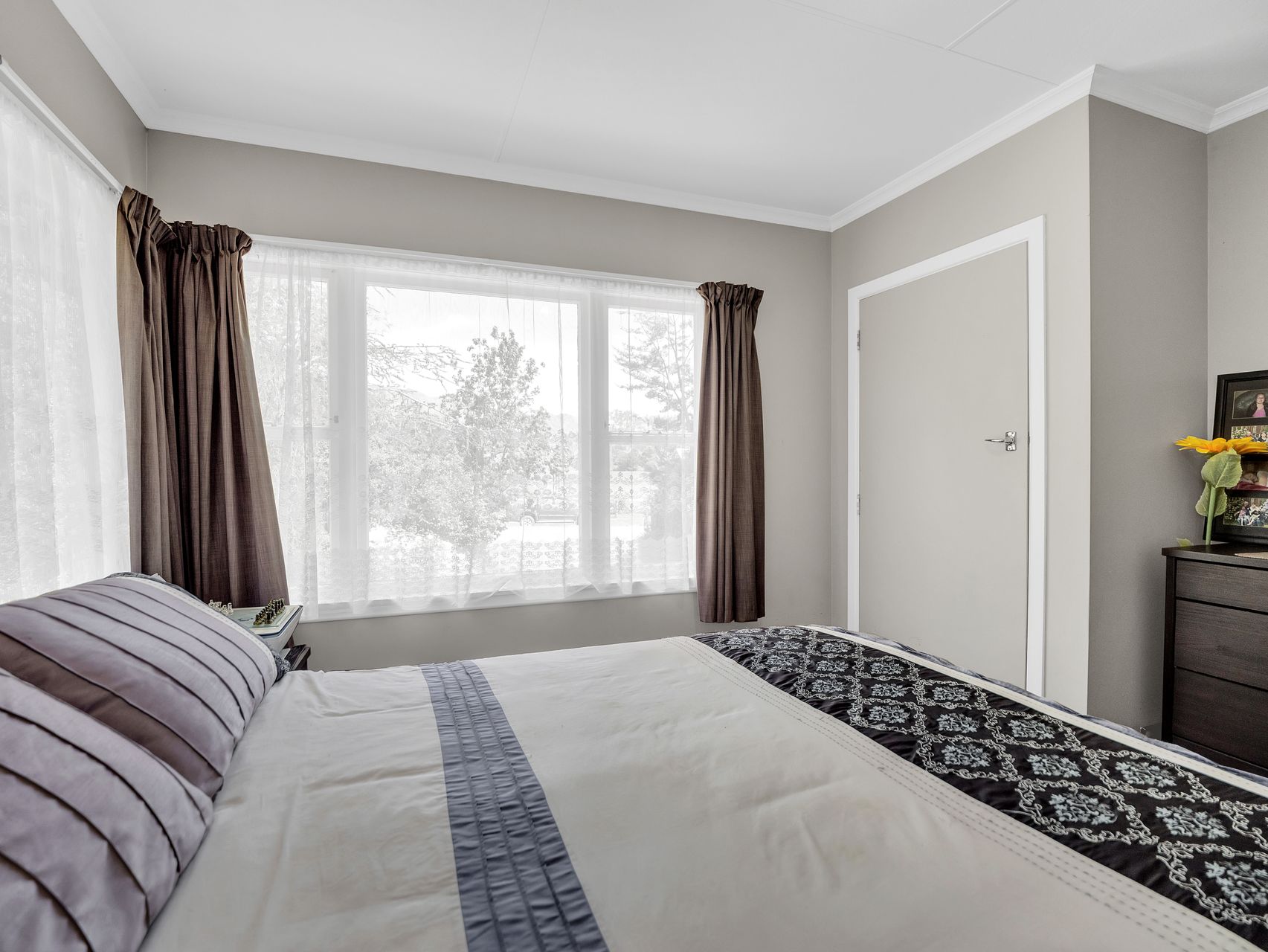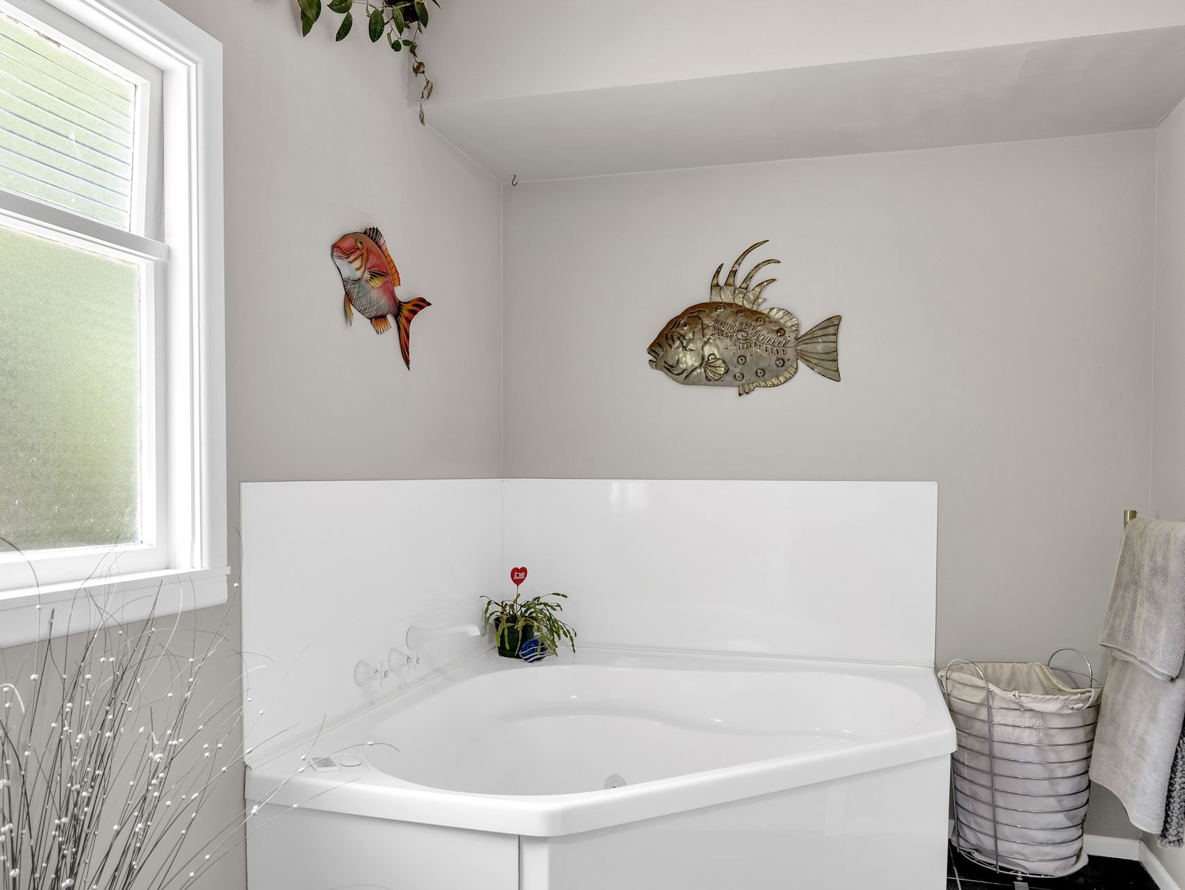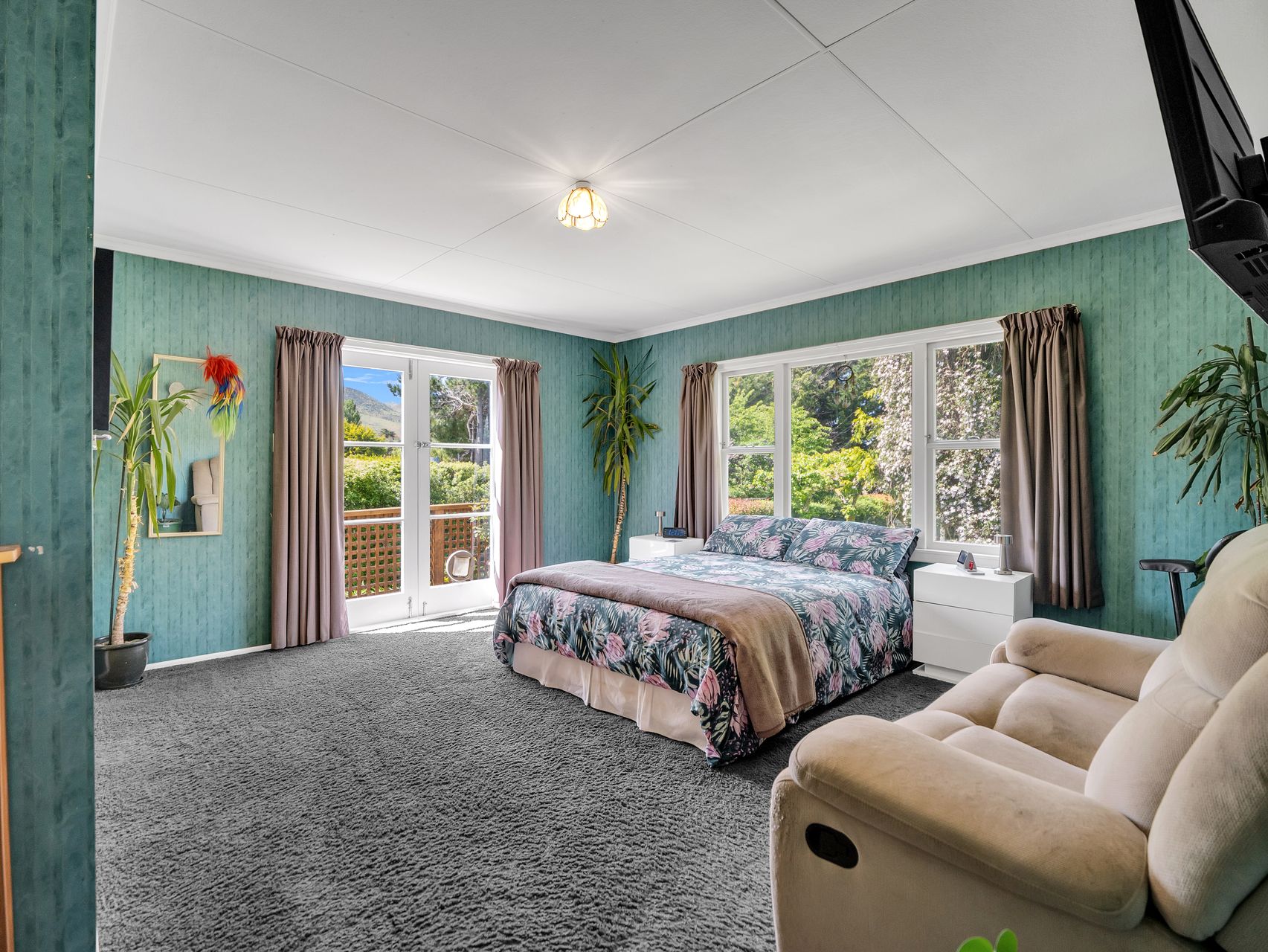 Two bedrooms are positioned for privacy and light, each framed by wide windows that draw the outdoors in. One opens directly onto the deck through bifold doors. The main bathroom combines modern design with country charm, featuring a sleek shower, soaking tub, white vanity and bold black-tiled floor, complemented by a separate toilet for convenience.