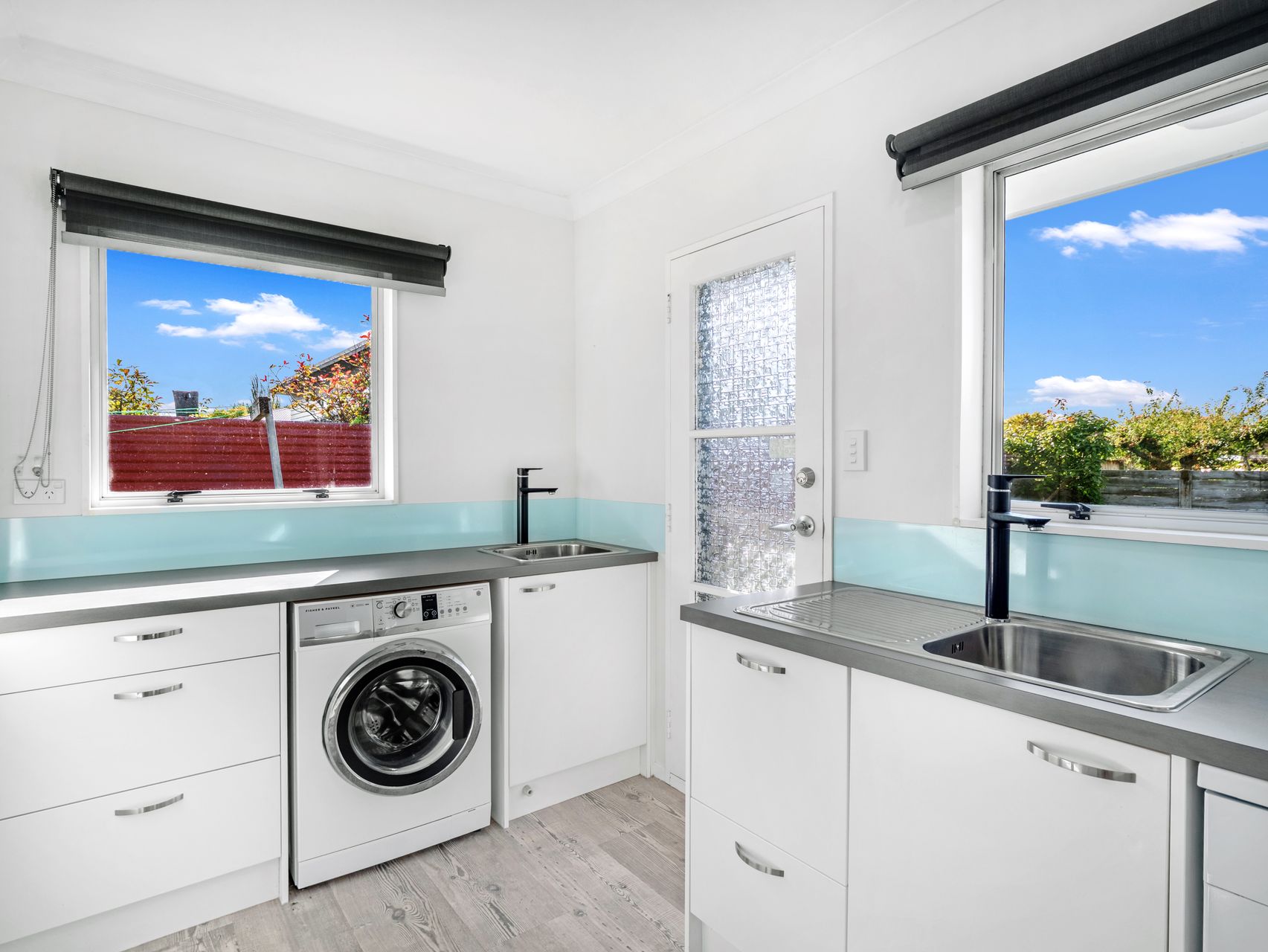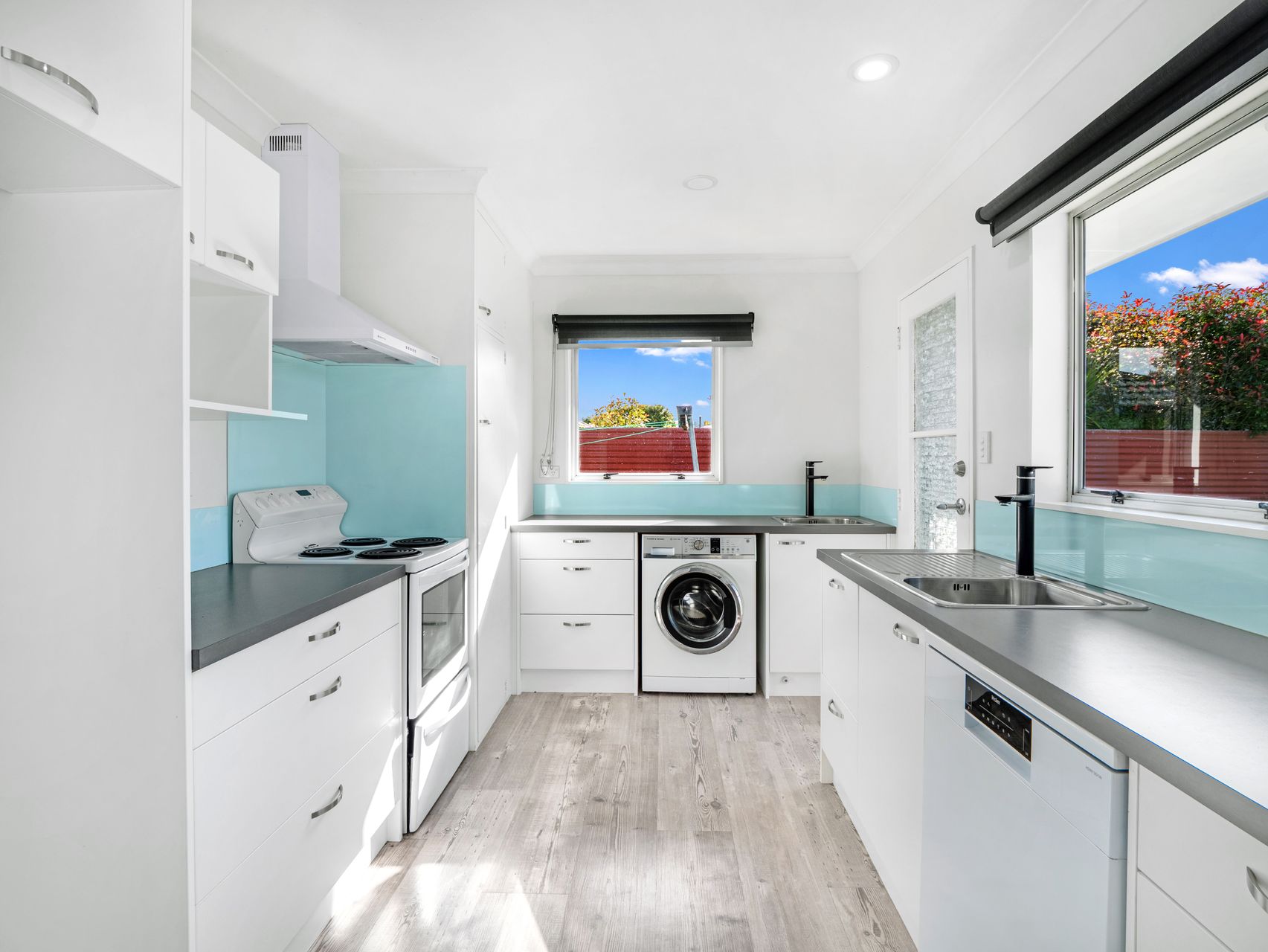 The modernised kitchen is practical and stylish, featuring a dishwasher and flowing into a combined laundry, complete with spacious bench tops and a washing machine.
